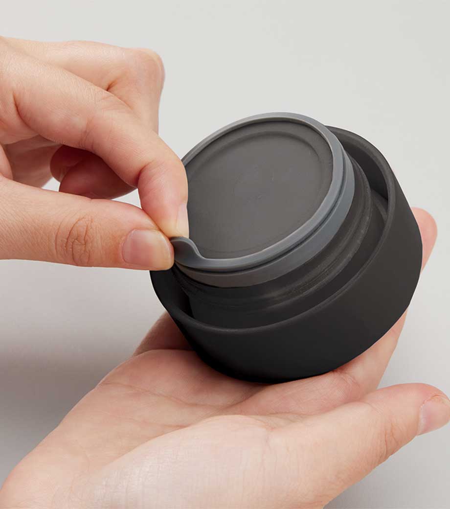 サイズ違いでいくつも試作品を作成し、男女それぞれで飲みやすいと感じるサイズを追求したアイテム。キャップ部分は指を2本引っかけられるようになっており、そのまま回してキャップが外しやすい形です。
