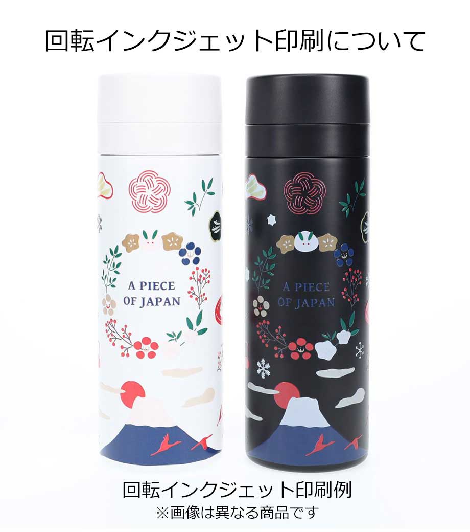 ボトル本体に1色印刷、天面にインクジェット印刷が可能です。回転シルクはくるっと大きく印刷できるので販促効果があります。本体色は優しいパステルカラーのブラウン・グリーン・ブルーの3色取混ぜです。落ち着いたカラーリングで名入れも映えます。女性向けアパレルショップのオープン記念品やコスメの購入特典、ノベルティにおすすめです。