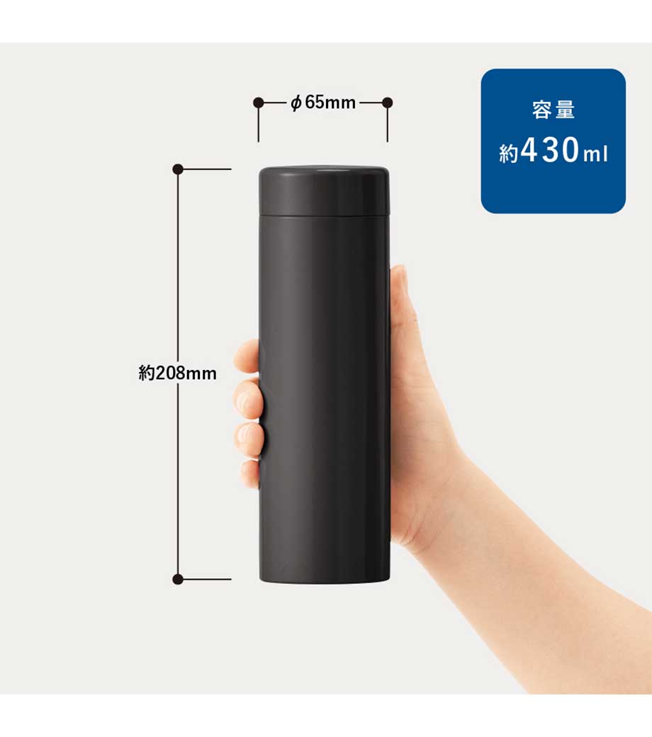 小さめのバッグやポケットに収まるので携帯に楽チン!シニアから若い女性層まで、お散歩時の水分補給や外出先でのサプリ・お薬用に便利と話題沸騰です。パプリカ1個分の約100gと超軽量だから、違う飲み物を2本持ち歩き!なんてこともできちゃいますね。シンプルなブラック・ホワイト、ゴージャスなシャンパンゴルードの3色をご用意。