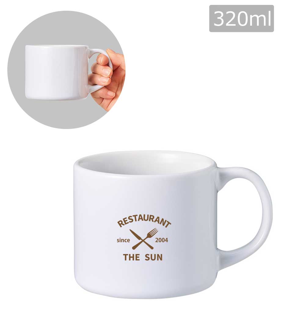 「陶器マグ ストレート(M+)」は、大容量340mlの陶器製マグカップ。定番ストレートタイプで持ち手が広いのも使いやすく人気なポイントです。シンプルなデザインで真っ白なボディは名入れがよく映えます。