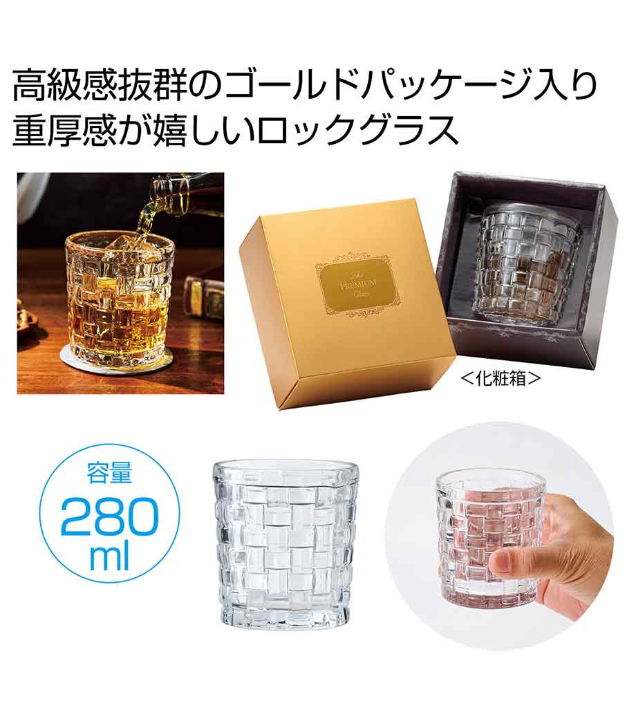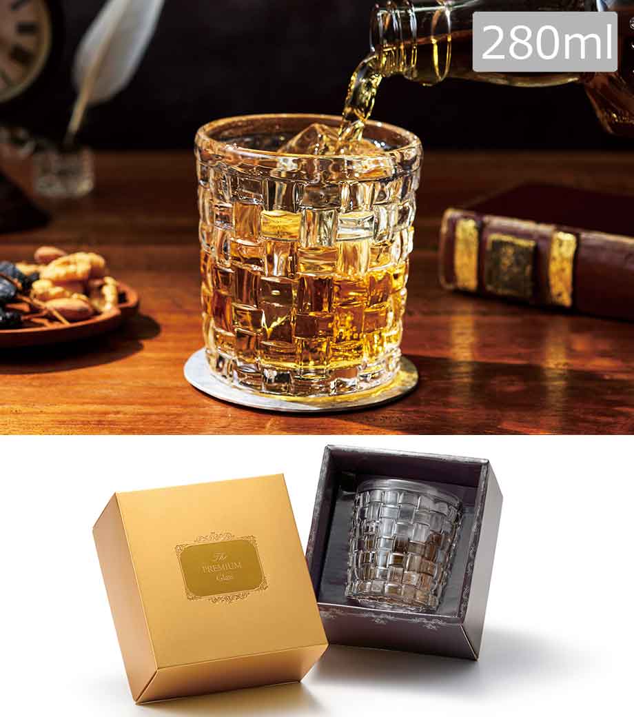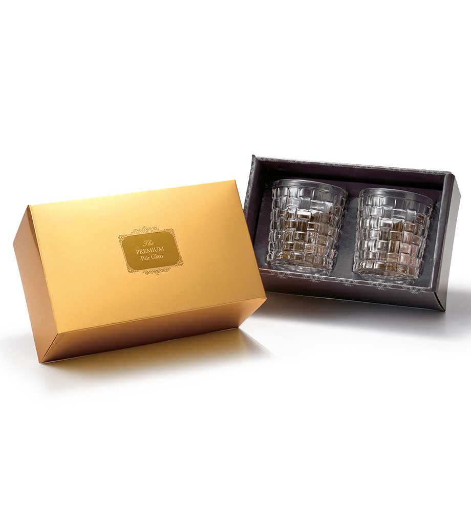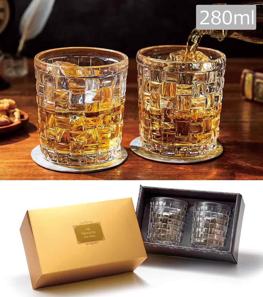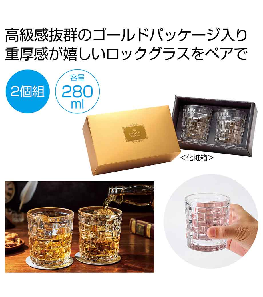 重厚感のあるロックグラスが2つ入ったギフト商品です。容量約280mlで、ウイスキーや焼酎をゆったり楽しめます。表面に市松の凹凸が施され、シンプルながらも飽きのこないデザインが魅力。手にも馴染みやすい形状です。高級感のあるゴールドの化粧箱入りでお届けします。
