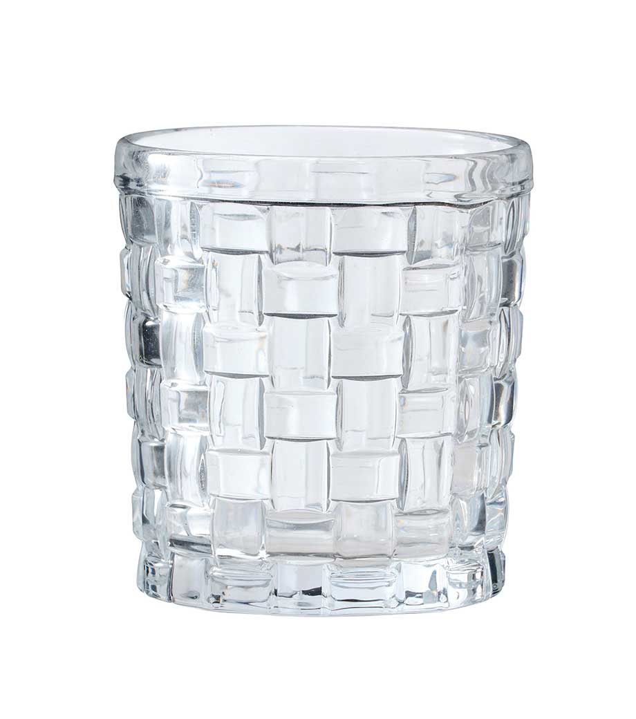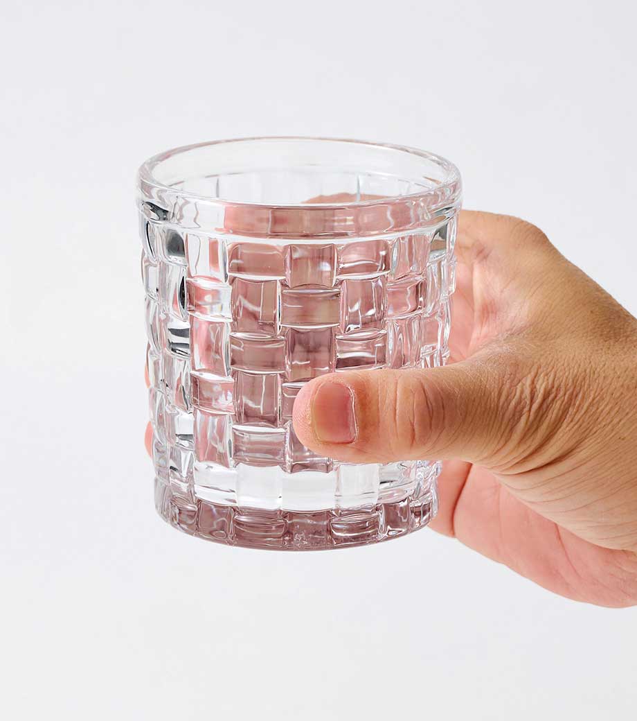重厚感のある佇まいのロックグラスです。表面に市松の凹凸が施され、シンプルながらも飽きのこないデザインが魅力。手にも馴染みやすい形状です。容量約280mlで、ウイスキーや焼酎をゆったり楽しむのにぴったり。