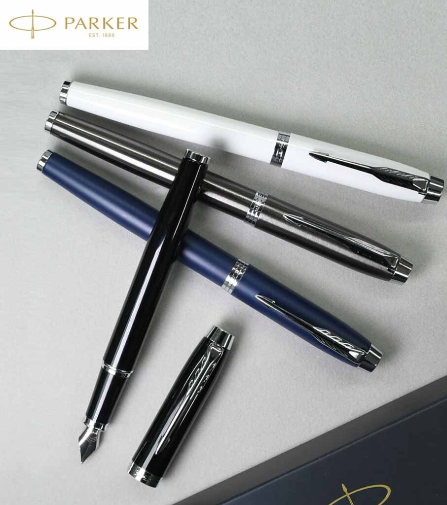 英国の老舗筆記具ブランド「パーカー」の万年筆。パーカーの代名詞でもある洗練された矢羽クリップに、シックなカラーを合わせた都会的なイメージが印象的。メーカー名が刻印されたリング部分はクローム(鏡面)仕上げで上品さをまとい、書くことをスタイリッシュに演出する逸品です。