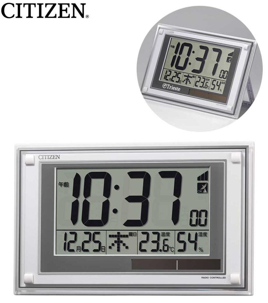 壁置き兼用で文字が大きく、遠くからも時間を確認できます。温度・湿度・カレンダー表示付き。