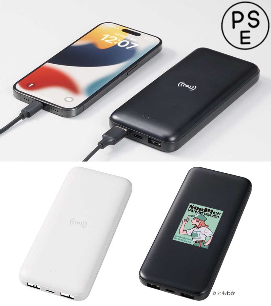 外出先でもスマートに使える、ワイヤレス機能付きのモバイルチャージャーです。スマホを置くだけで簡単にワイヤレス充電ができ、さらに有線と合わせて2台同時に充電可能。残量表示ランプ付きでバッテリー残量もひと目で確認できます。容量は安心の10,000mAh。シンプルなデザインながら印刷面が広く、名入れがしっかり目立つのも魅力です。