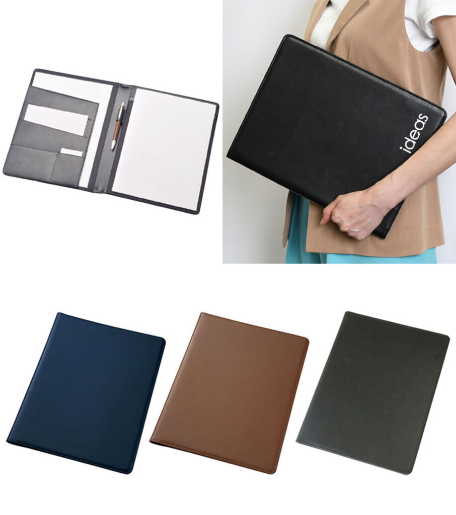 レザーA4レポートパットカバーは、会議の書類をさっと挟み、ノートにすばやく書き込め、必要なメモをポケットに仕分けて入れておける便利なファイル。