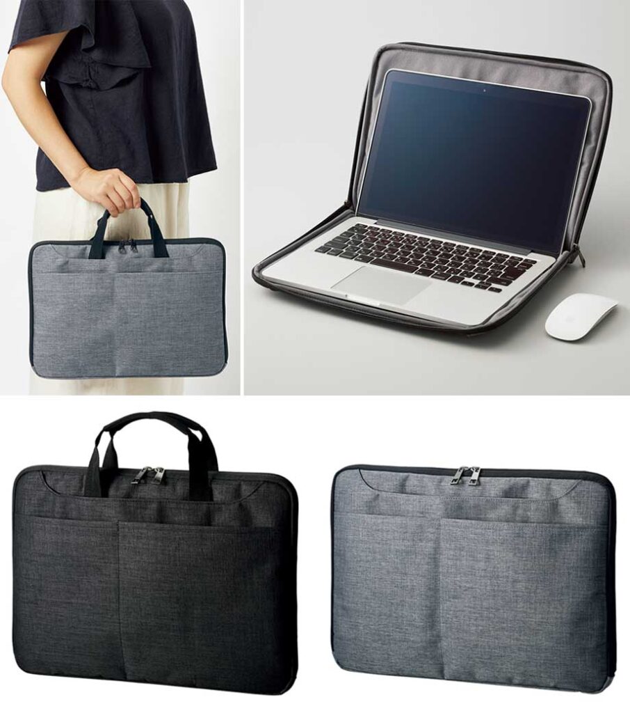 13.3インチまでのパソコン・タブレットを収納できるバッグです。ハンドル付で軽量。4か所ある外側のポケットにスマホや資料、メモ帳など必要な小物を入れられます。ハンドルは折りたたんでポケットに収納可能。ダブルファスナーで大きく開き、パソコンをバッグにいれたまますぐに操作可能できるからバッグから取り出す手間が省けて、外出先の使用にも役立ちます。