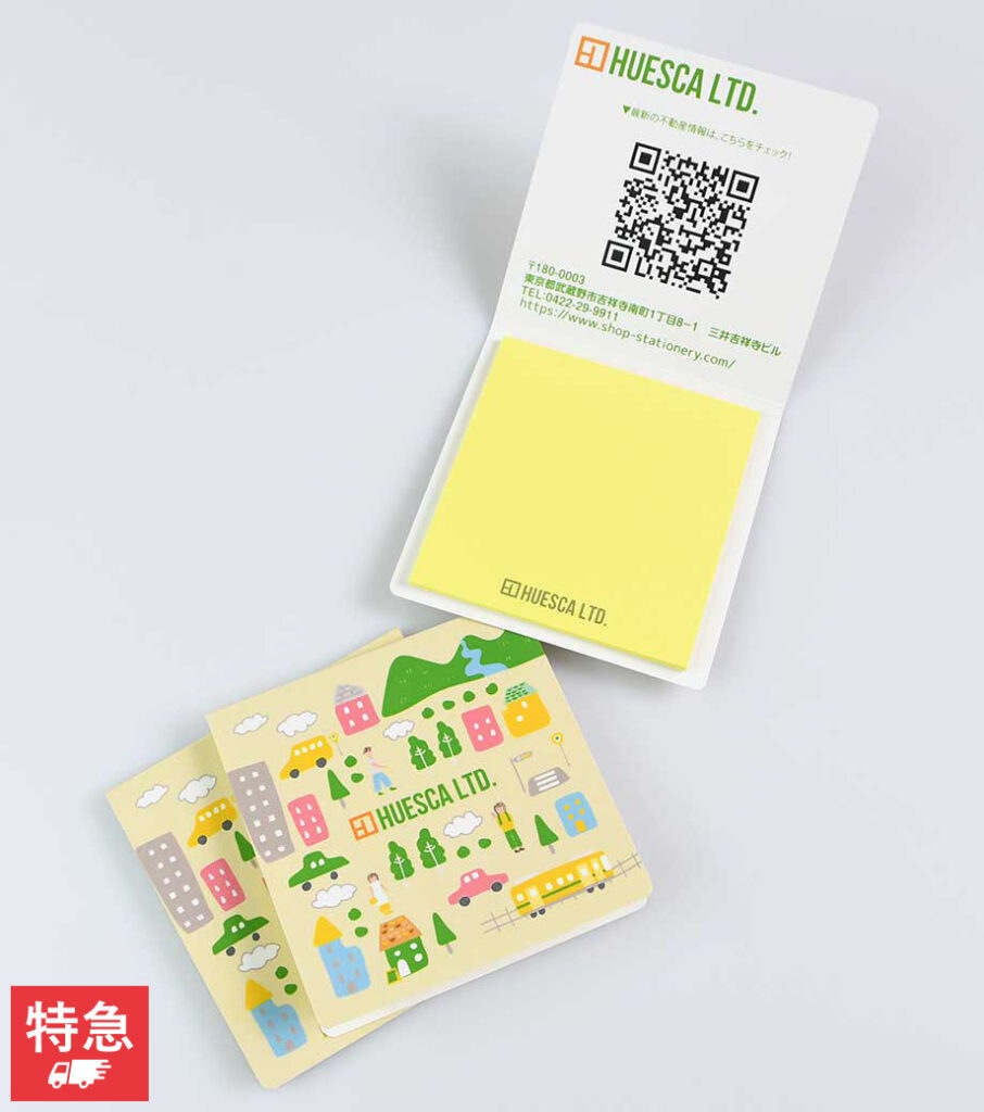 使い勝手のいいスクエア形状の付箋は、オンオフ問わず普段使いに便利。展示会やオープンキャンパスの来場ノベルティ、卒業記念品や施設のオープン記念品など幅広いシーンで配布できます。ポストインできるサイズなので資料などと一緒に気軽に郵送も可能です。