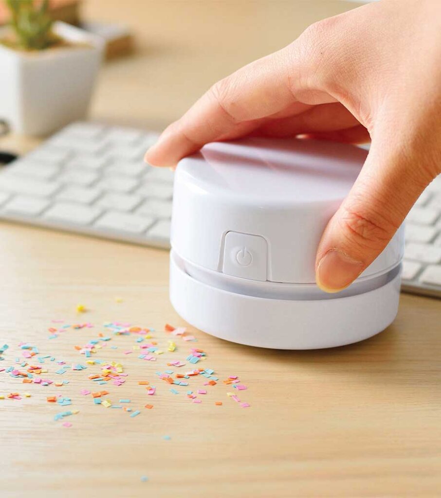 卓上コンパクトクリーナーはデスク周りのお掃除にピッタリの手のひらサイズのクリーナー。消しゴムのカスやホコリなど、気になった時すぐに使えます。吸収力がよいので、キーボードのお手入れにも大活躍。作動はボタンを1回押すだけ!引き出しにしまえる小ぶりなサイズ感で、どなたでも簡単に使えます。