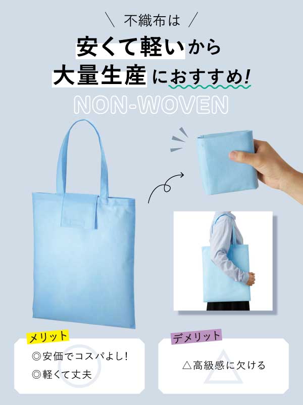 不織布製エコバッグは、繊維を熱や化学的な処理で接着させて作られており、軽量性と耐久性に優れています。コットン製などの織られた生地と比べて大量生産が可能なため、価格帯は比較的安価なものが多いのが特徴。限られた予算のなかでバッグを作成したい場合、まずはじめに候補にあがることも多い素材です。