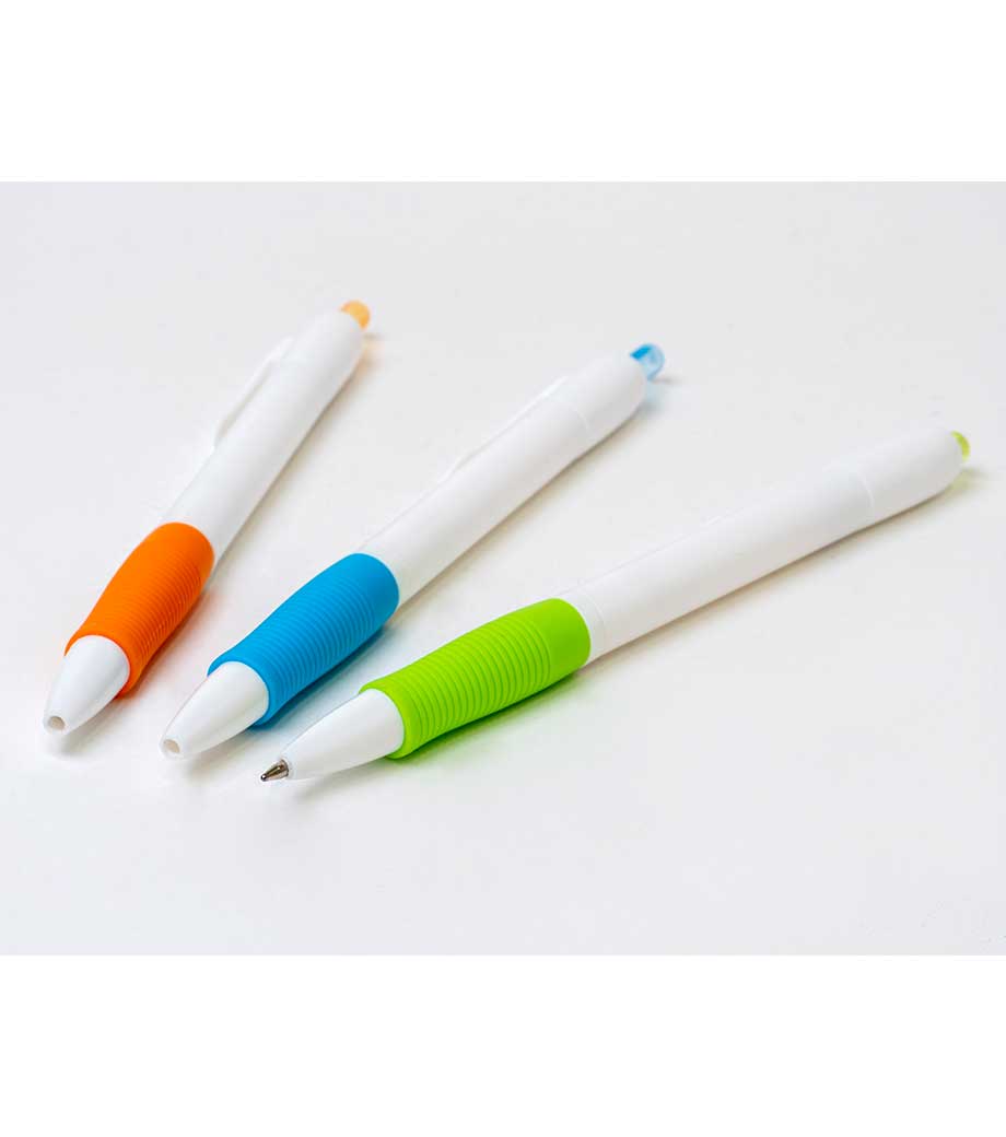 白軸とクリップ部に印刷が可能。ばらまきノベルティとしても定番のボールペン。カラフルなグリップ色でコーポレートカラーに合わせたオリジナルグッズが作れます。