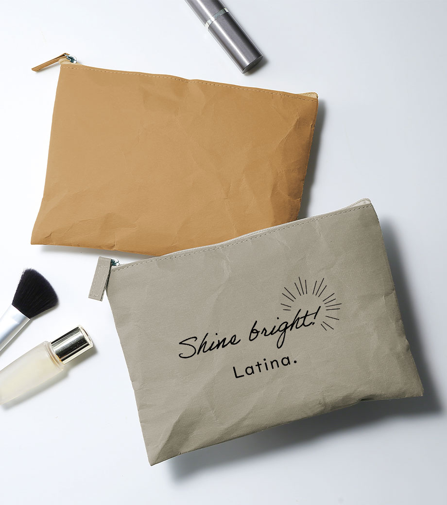 生地はしっかりしていて中身が透けない厚みです。付箋やメモと一緒に筆記用具を入れたり、メイク道具一式をまとめたりと、様々な用途で使えます。オリジナル印刷でショップやブランドロゴを入れて、購入特典や、雑貨店の開店記念品などにいかがでしょうか。