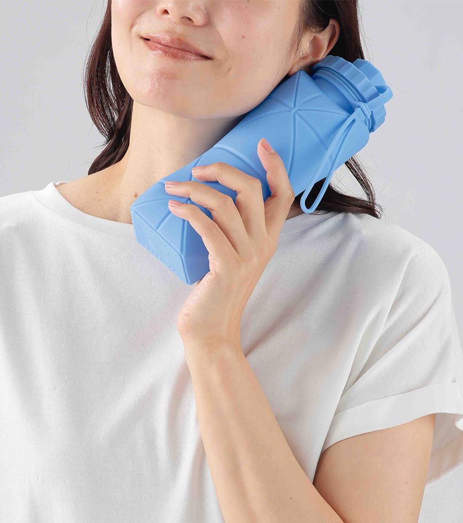 飲み終わったら手のひらサイズに畳めるシリコンボトル。飲み物を入れて冷凍すれば、氷のう・保冷剤代わりに使えます。容量はアクティブに動く日にも便利な600mlサイズ。フタパーツを外すと、大きめの氷も入れられます。折りたたみ用バンドは本体一体型で失くす心配がありません。パーツ分解が可能で、お手入れしやすいのが嬉しいポイント。ブルー・グレーの2色を取混ぜでお届けします。