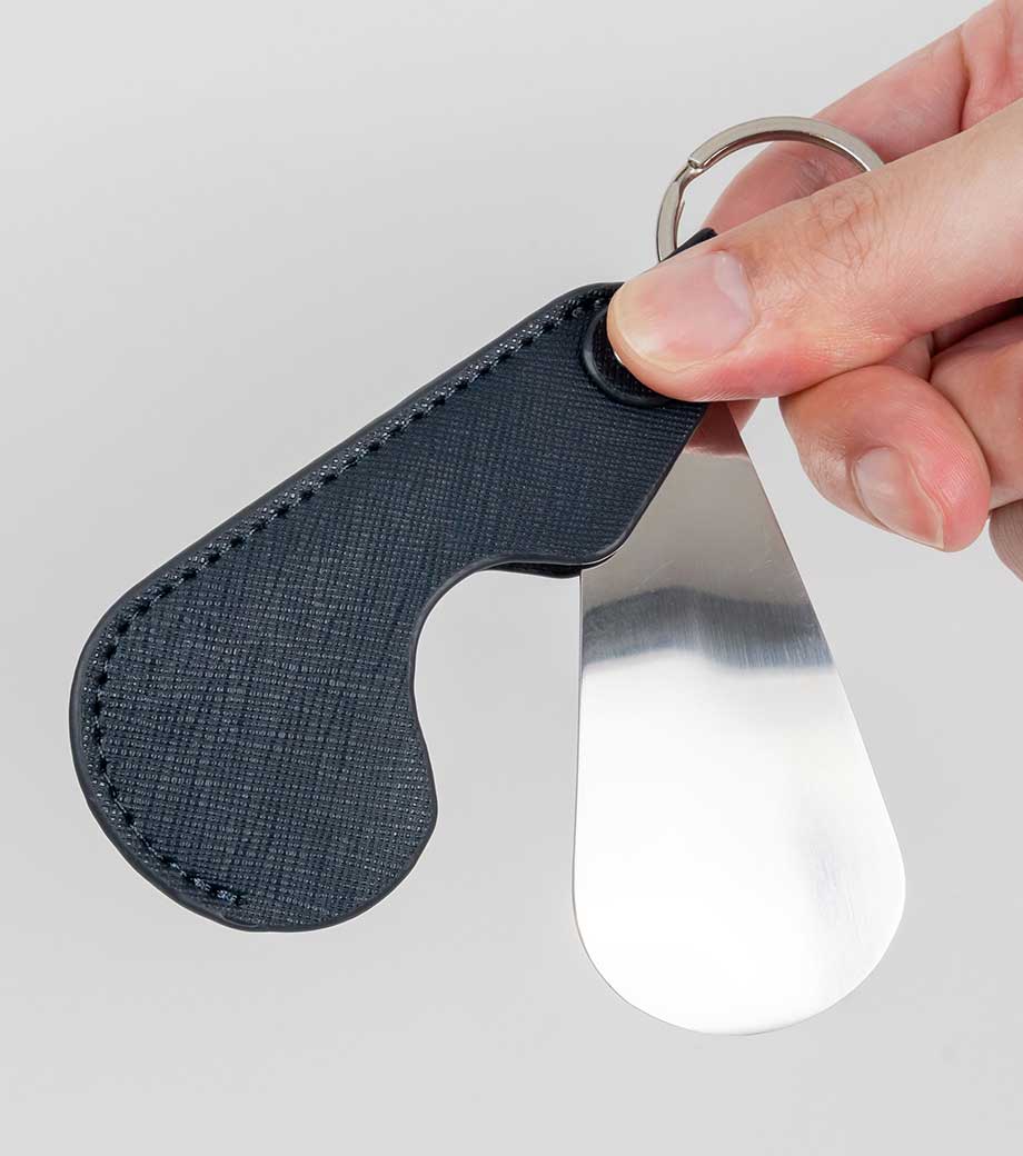 「レザーボタントレイ」は、アクセサリーや小銭など、身の回りの小物をちょっと入れておくのに便利。ボタンを外せばフラットな形状になり、折りたたみ可能。旅行の携帯にも便利です。色味は、シックで落ち着いたブラックとネイビー。手になじむリサイクルレザーで作りました。