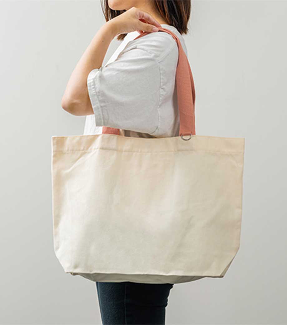 コットンナチュラルショルダートートはB4サイズの書類も持ち運べる薄手綿タイプのショルダートートバッグ。便利なロングタイプの持ち手になっているので、肩にかけやすいのが嬉しい!カタログも入れやすいフラットトートです。