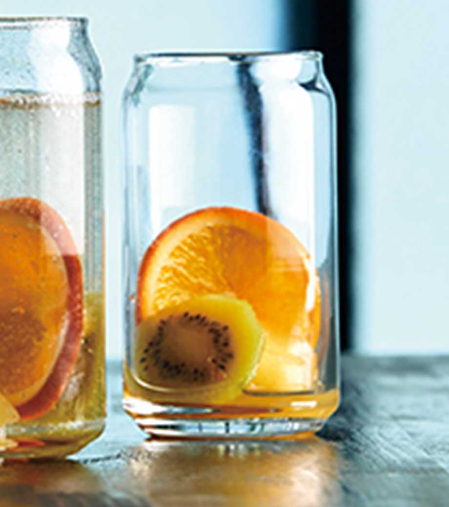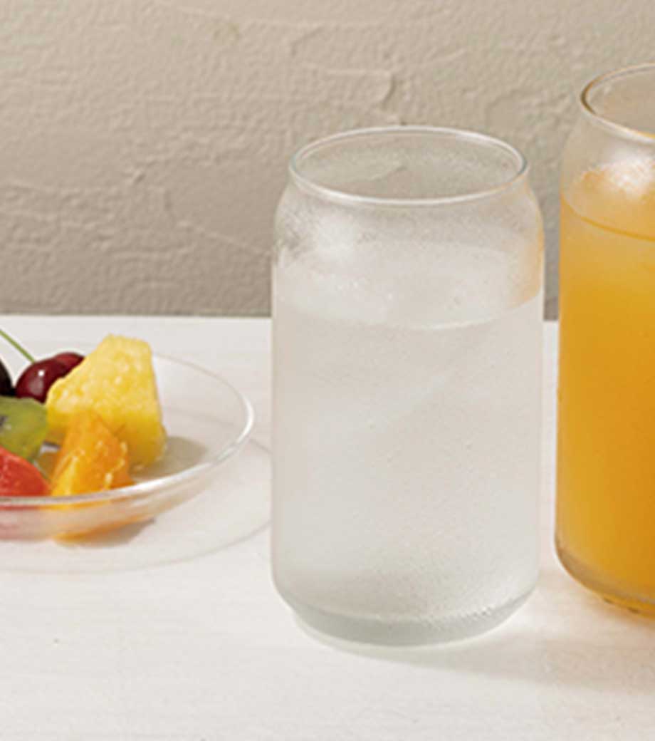 飲料缶をモチーフにした、思わず手に取りたくなるユニークなグラスです。飲み切りやすい約360mlで、日常使いにちょうどいいサイズ感。透明感を活かして飲み物の色合いも楽しめます。花瓶や小物入れなどインテリアグッズとして使えるのも魅力です。
