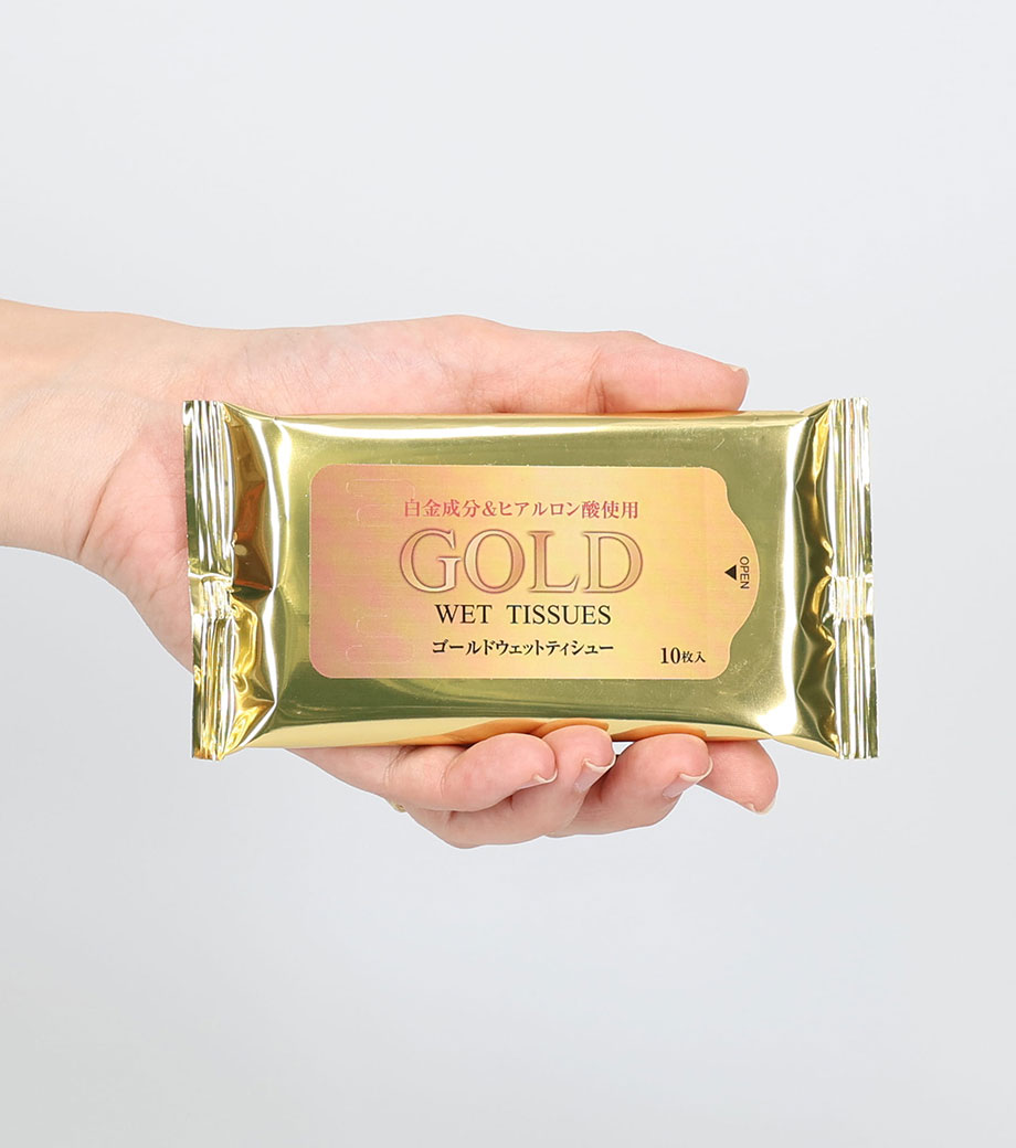 ひと目で印象に残る華やかなウェットティッシュ。高級感あふれるゴールドパッケージはインパクト抜群で手に取った瞬間に特別感を演出します。
