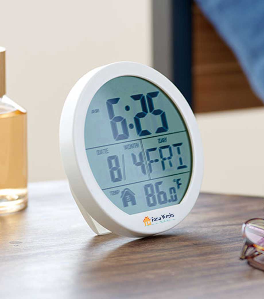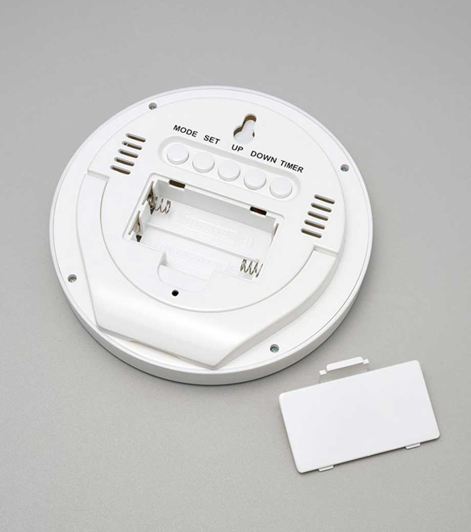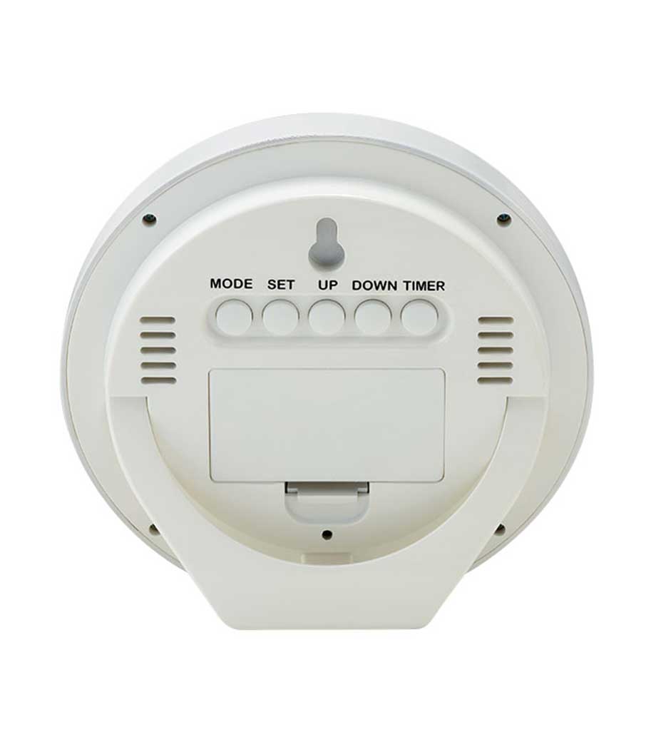 置き型・壁掛け兼用で、清潔感ある白枠の丸い時計。液晶が大きく視認性が高いので離れた位置からでも見やすく、カレンダー・温度表示・アラーム(スヌーズ機能)・タイマーも付いています。