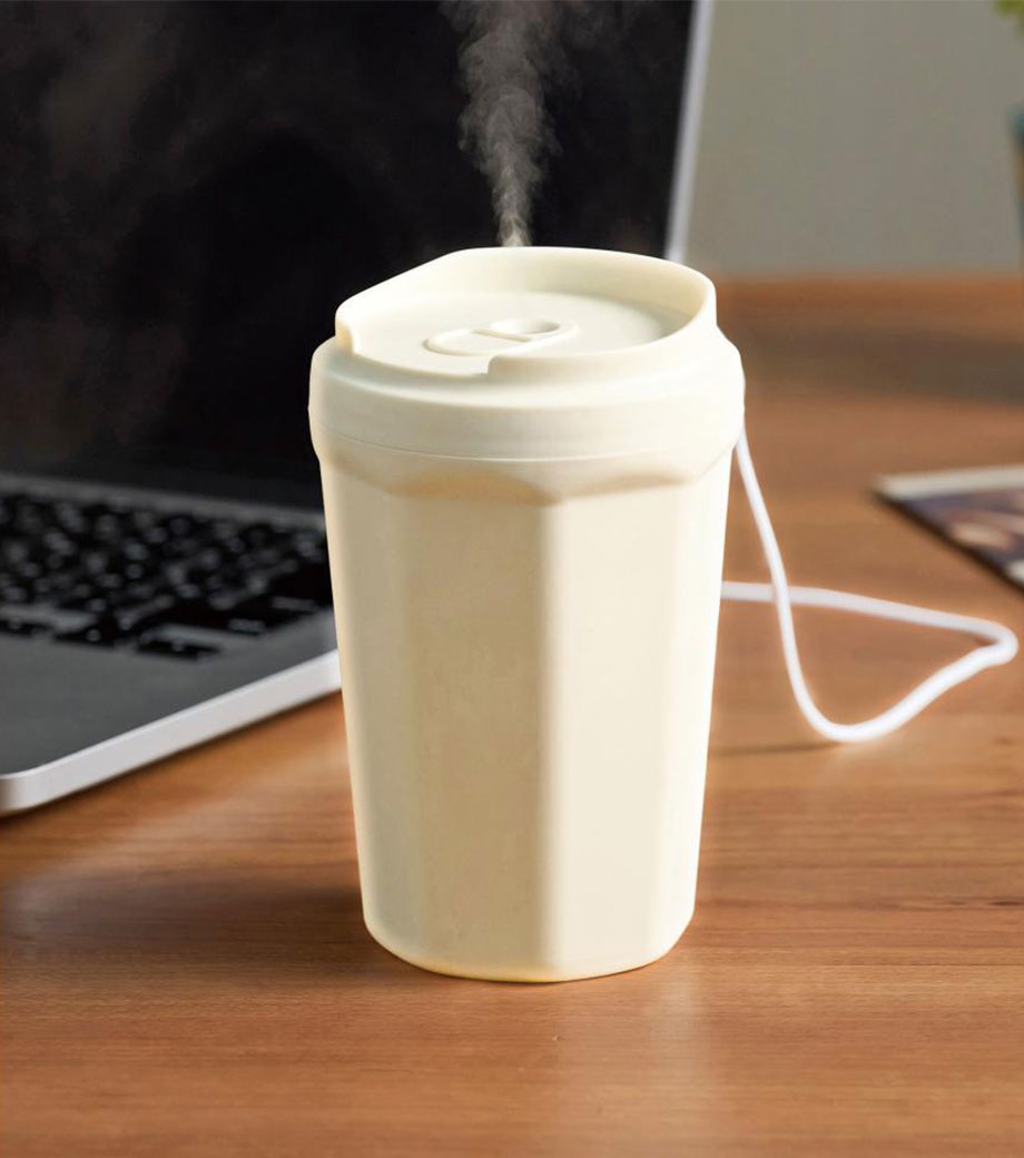 タンブラーのようなすっきりとしたフォルムが魅力加湿器です。車のドリンクホルダーに収まるサイズ感でデスク周りはもちろん、車での移動中の乾燥対策にも大活躍。
