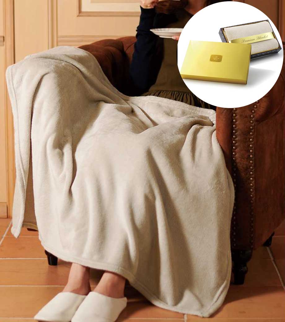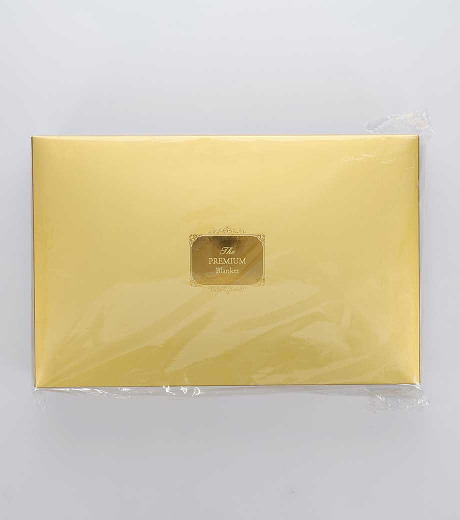 ゴールドの化粧箱に入った手頃な価格ながらも上品な印象を与えるブランケットです。