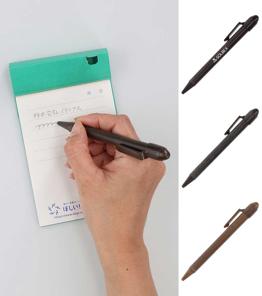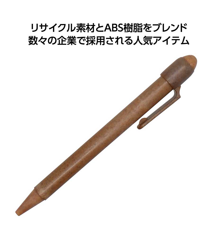 コーヒーやお茶の残渣、木くずなど、本来捨てられるはずだった素材を活かした完全日本製のエコボールペンです。リサイクルならではのやさしい質感と天然素材のぬくもりを感じるカラー展開。オフィスやイベント、日常使いまで幅広い世代にフィットします。