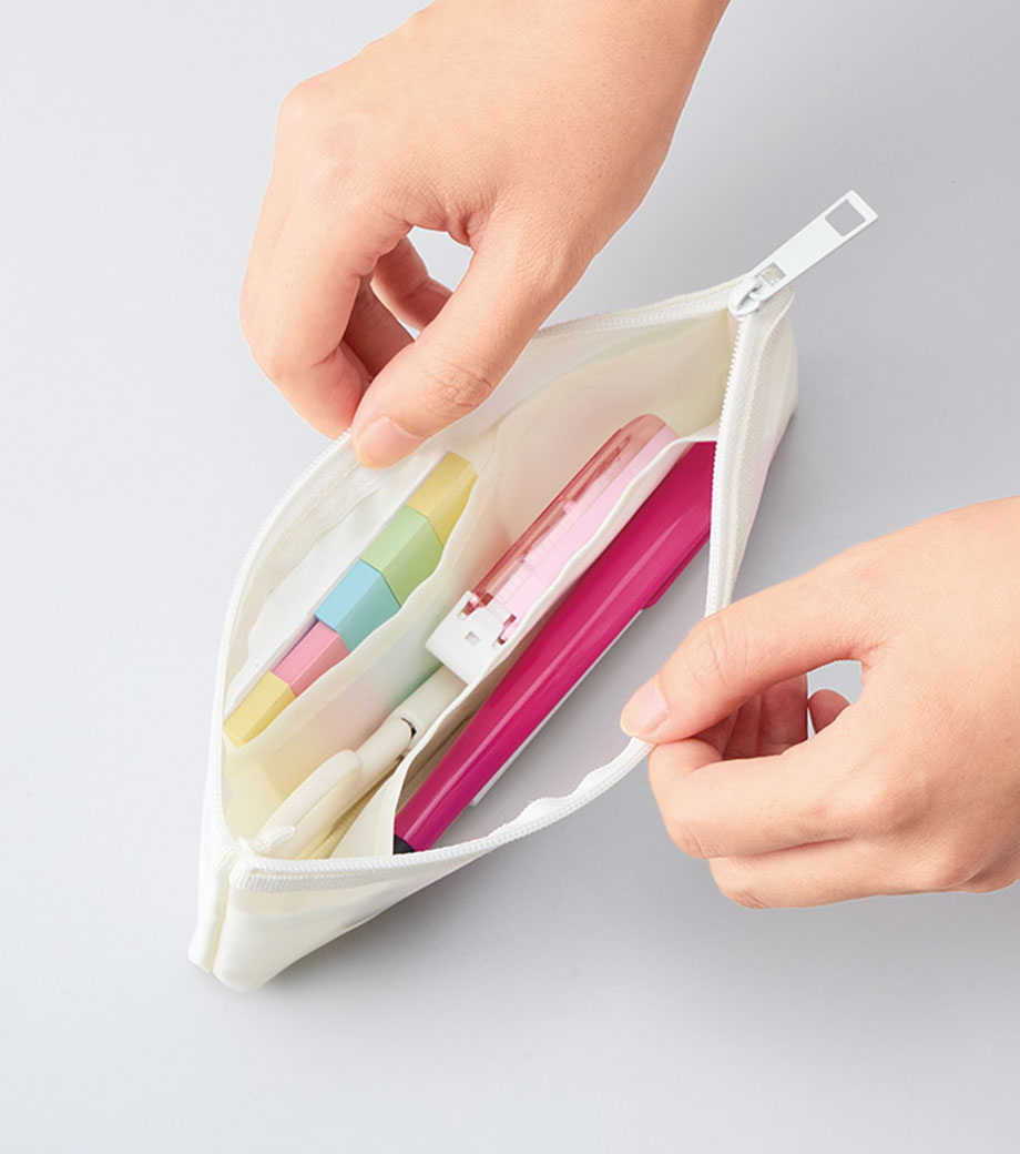 使いやすさとデザイン性を兼ね備えたシンプルで丈夫なフラットポーチ。収納後も厚みが出ずバッグの中でもかさばりません。ステーショナリーやコスメポーチにぴったりなサイズ。さりげなく主張するカラーファスナーがポイントです。キーホルダーやチャームを取り付けられるループ付き。10色からお好きな色を選べます。