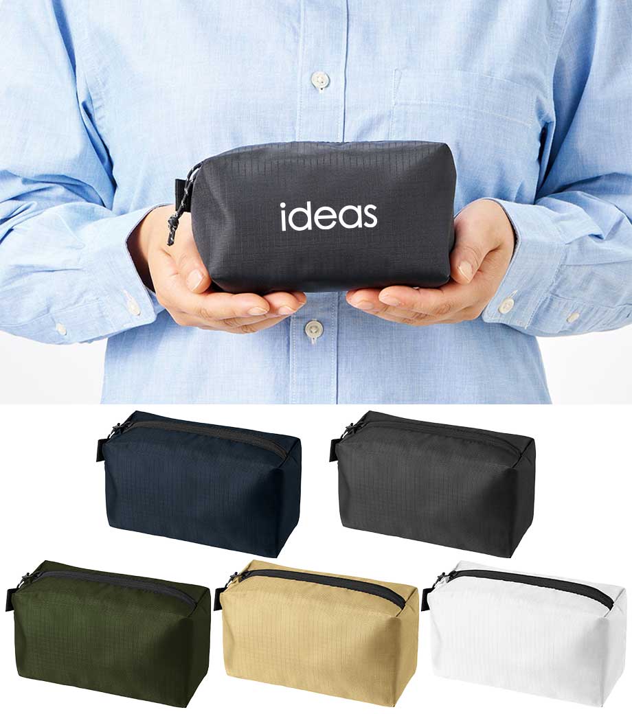 バッグにスッキリ収納できる、キャンバス地の薄型ポーチ。ファスナーはカラフルながら収納部は生成りなので、誰もが使いやすいデザインです。A5ノートが入る大きめサイズで、歯ブラシセットやヘアブラシ、ミニスプレーボトルなどを入れてお泊り用ポーチにも。チャームやキーホルダーでカスタム自在のループ付きです。