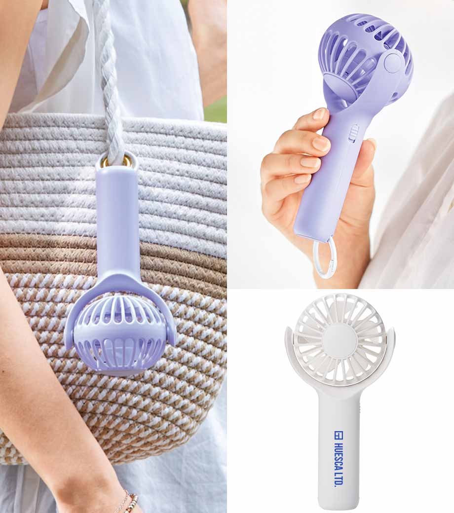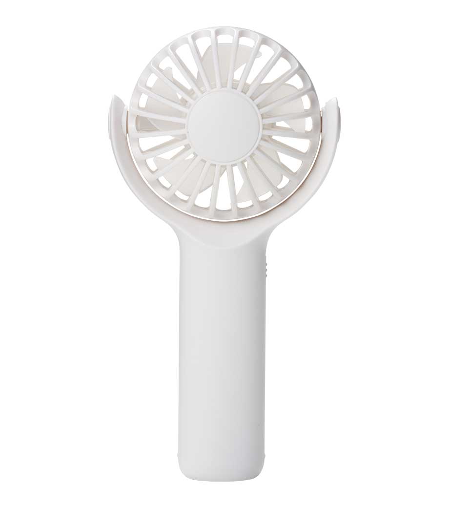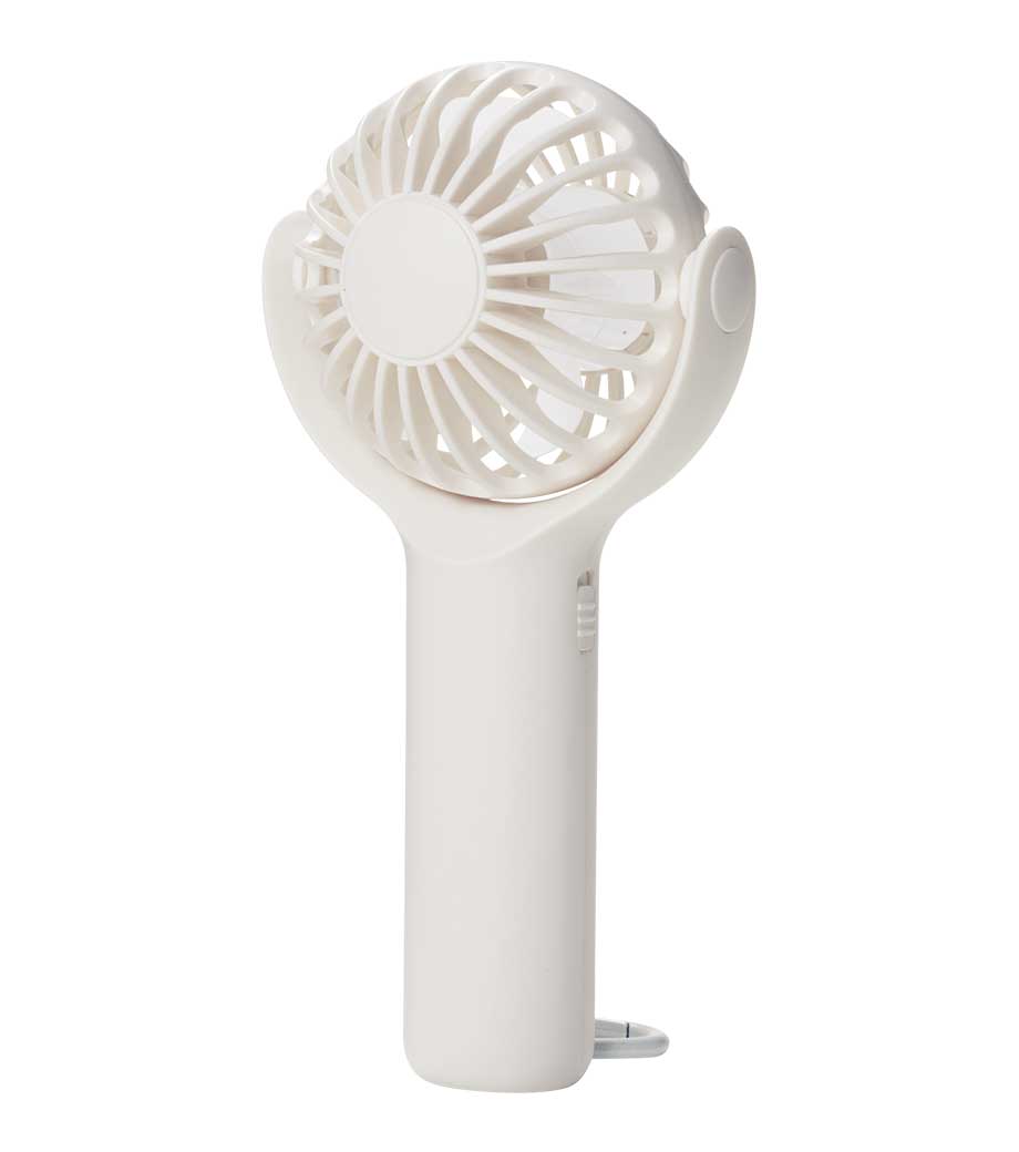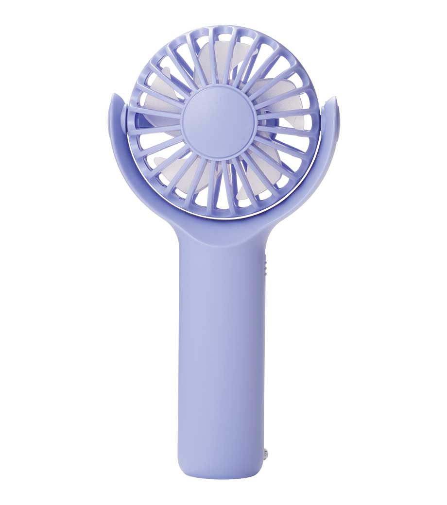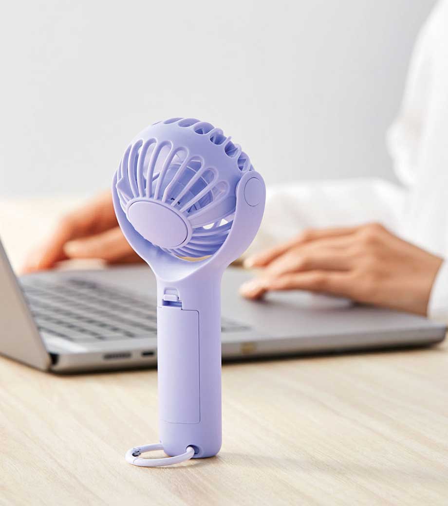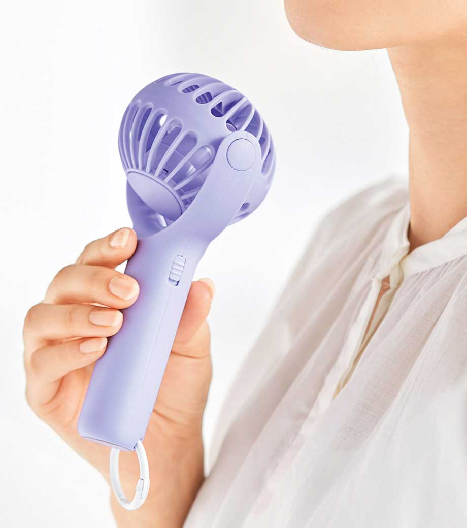 ヘッドを前後に360°回転できる乾電池式ハンディファン。角度調節しながら手持ちできるから快適に使えます。底面に滑り止めを備えた卓上ファンとしても安定感抜群。カラビナで鞄に掛ければ、吊り下げたまま風向きを自在に調整できます。