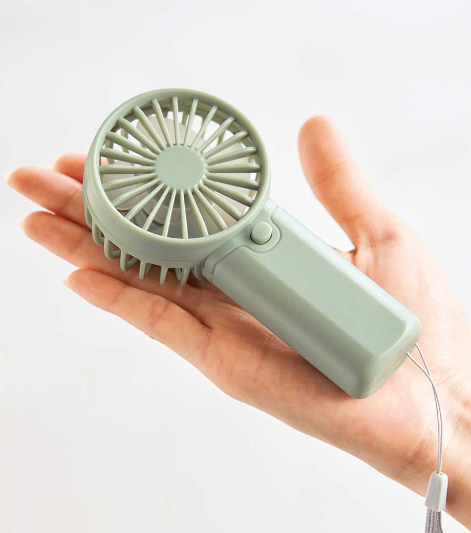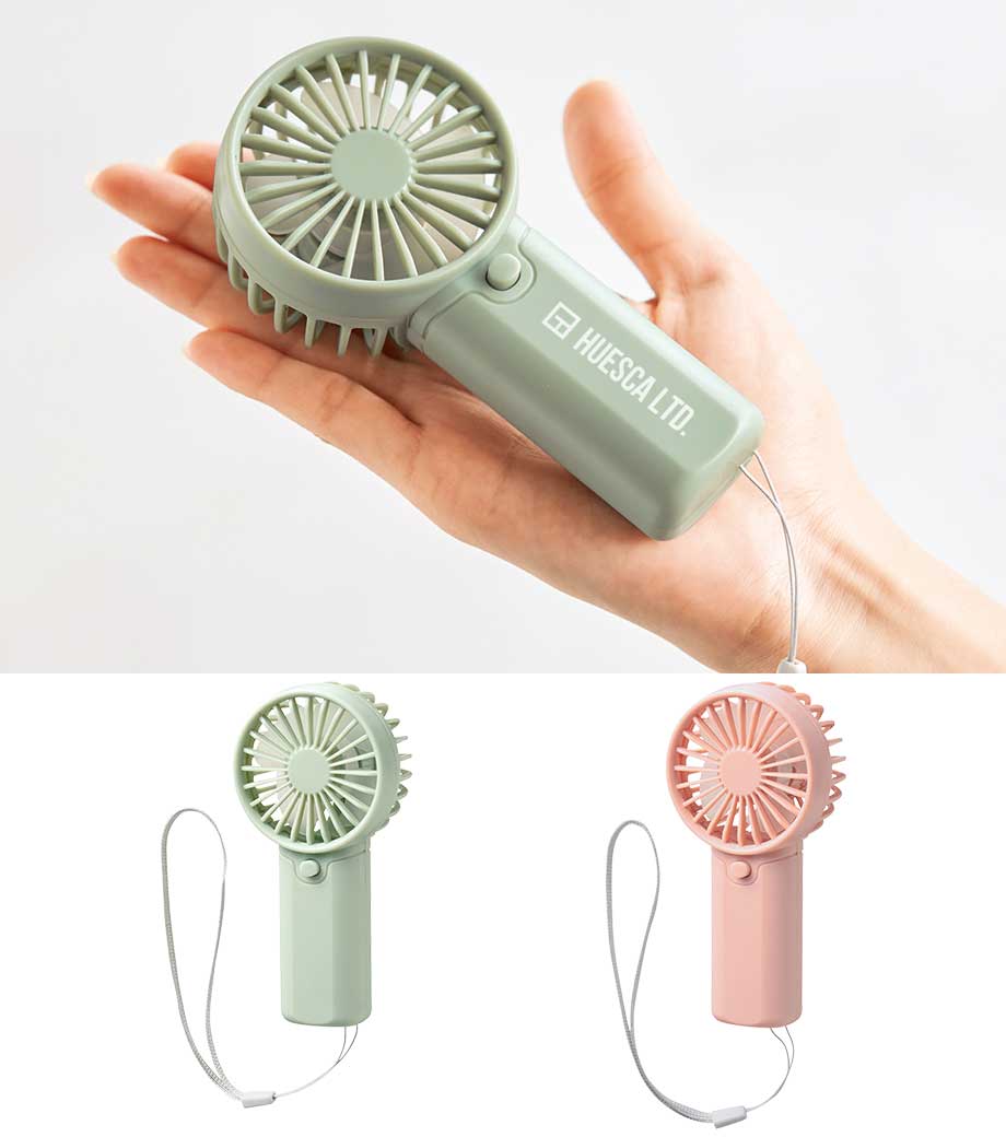 手にすっきり収まるコンパクトサイズの乾電池式ハンディファンです。シンプル操作で使いやすく、落下防止ストラップ付きなので屋外イベントでも安心です。ピンク・グリーンのお洒落なくすみカラーを取り混ぜてお届け。