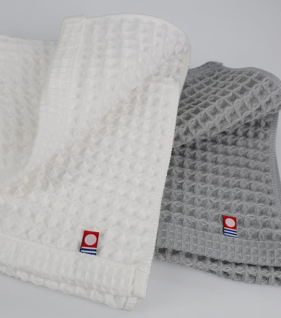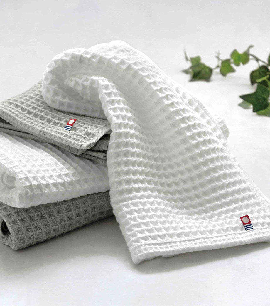 もらって嬉しい日本製の今治フェイスタオル。凹凸のあるワッフル織り仕様で、表面が毛羽立ちにくいのが特長です。安心の綿100%で吸水性に優れており、日常使いしやすいサイズ感。毎日使いたくなる一枚です。