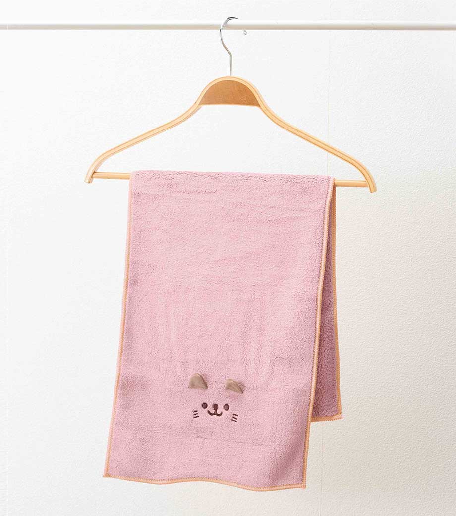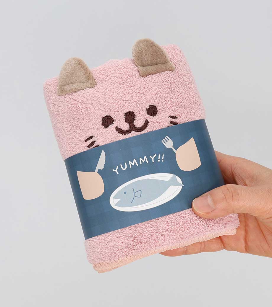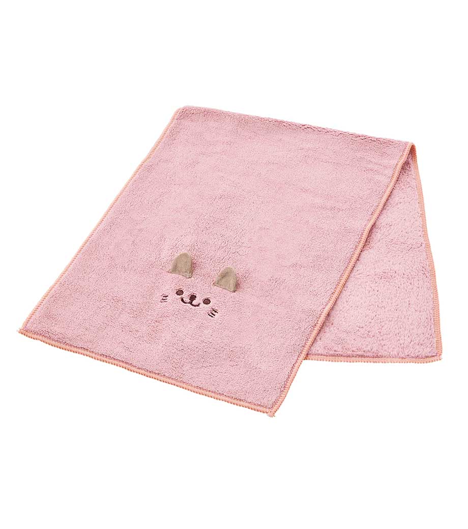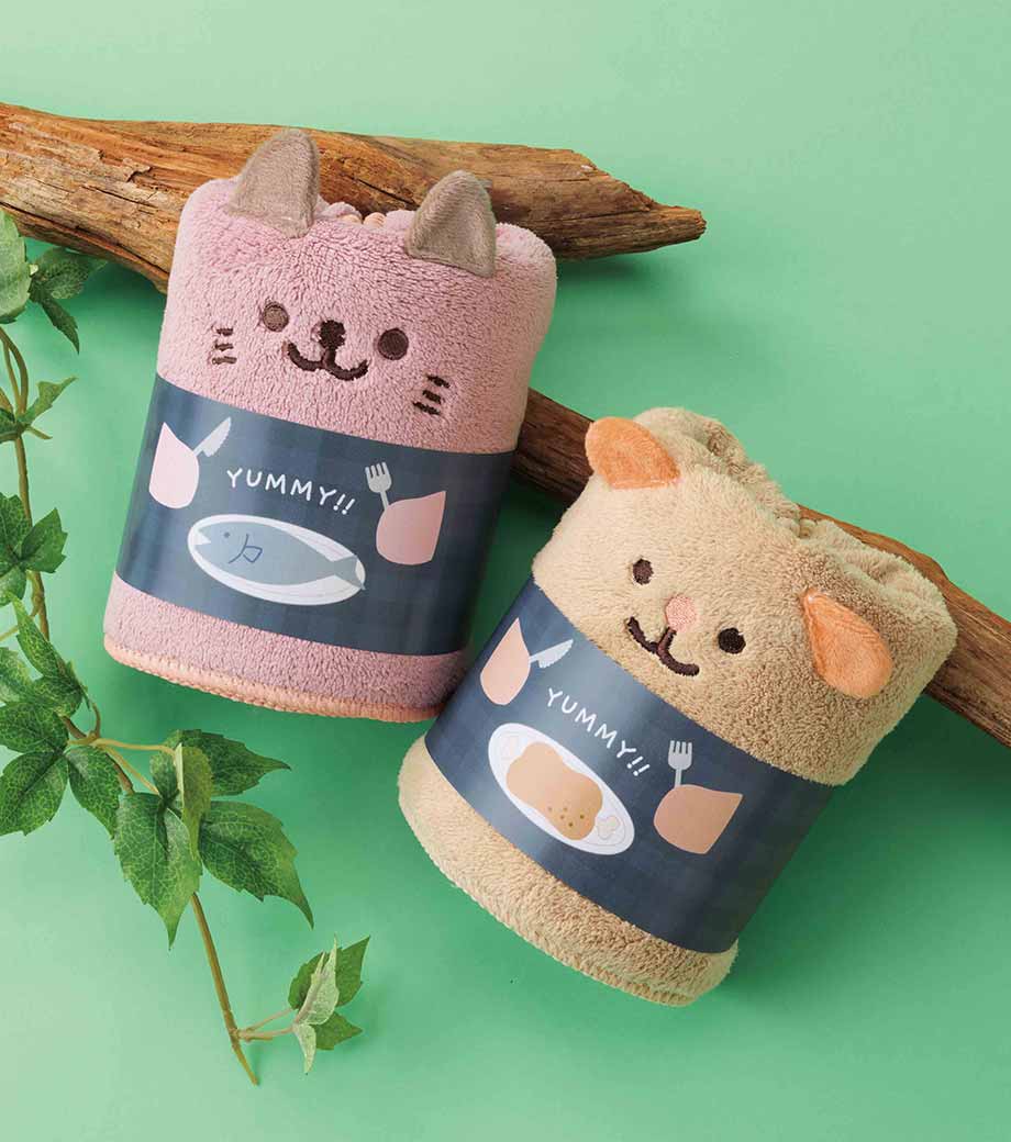 猫耳や犬耳がちょこんと付いた、ぬいぐるみのような可愛らしさが魅力のタオルです。折りたたむとふわふわのマスコットのように見えるデザインで、見た目の楽しさと実用性を兼ね備えています。素材には吸水速乾性に優れたマイクロファイバーを使用しており、日常使いしやすいフェイスタオルとして活躍します。