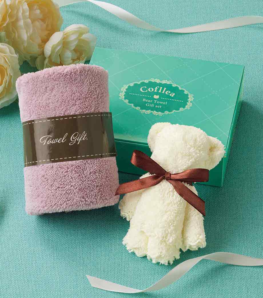 くまのぬいぐるみ…と思いきや、実はくまの形に折りたたまれたタオルが入った可愛いギフトセットです。大小サイズのハンドタオルは、ふわふわのマイクロファイバー素材を使用しており、やさしい肌ざわりで実用性もばっちり。コンパクトな箱入りで持ち運びしやすく、軽量なのでイベントやキャンペーンでの配布にもおすすめです。
