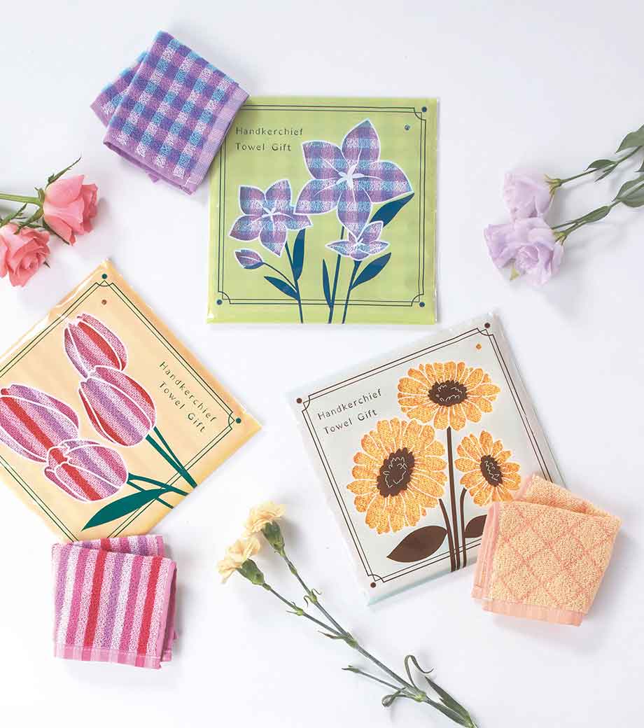 華やかさが目を引く、花形の窓付きパッケージに入ったカラフルなハンドタオルです。綿100%のやわらかな肌ざわり。見た目の可愛らしさに加え、安価でばらまきやすいのも魅力です。