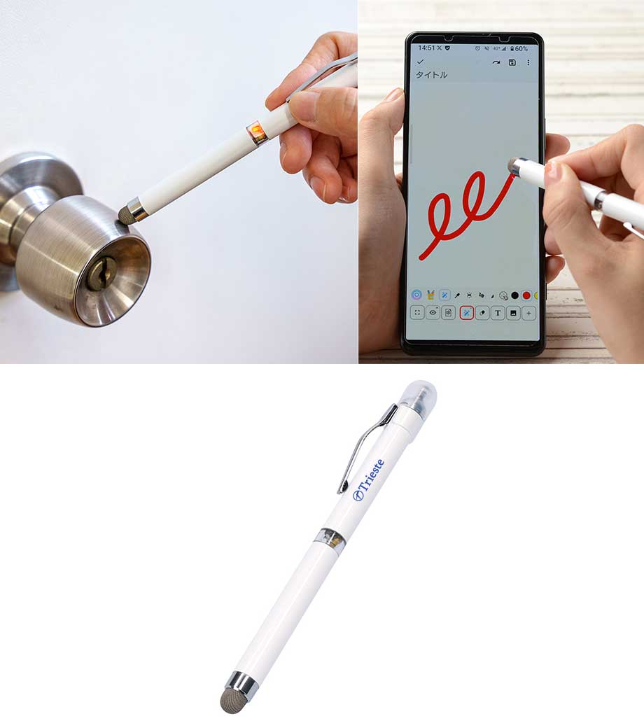 タッチペンとしても使えるボールペンは、ビジネスの必須アイテム。どなたにも喜ばれる、ノベルティの新定番です。「タッチペン付メタルスリムペン」は、ユニセックスに使えるスリムなフォルム。軸をくるりと回してペン先を繰り出すスクリュータイプ。iPhone、iPad、スマートフォン、タブレットPCのタッチペンとして使えます。