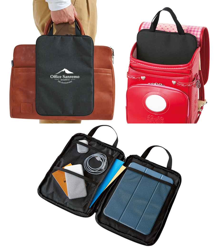 コの字に大きく開くダブルファスナーは出し入れしやすく快適です。フラットな形状で通勤、通学バックの中でもかさばらず持ち運び。しっかりハリのある素材で2mm厚のクッションが端末を保護してくれます。1色の名入れ印刷が可能で、企業名や学校名を入れた記念品におすすめです。