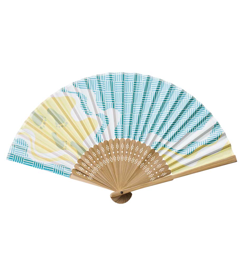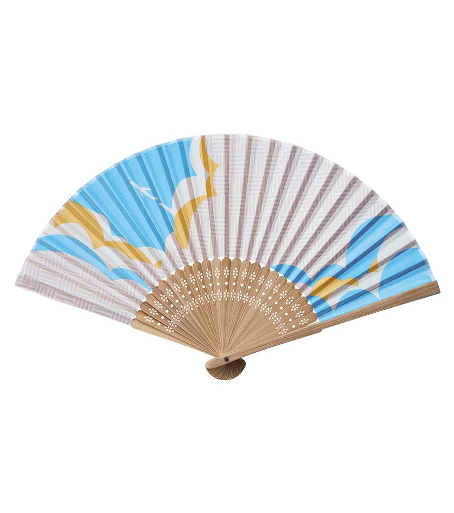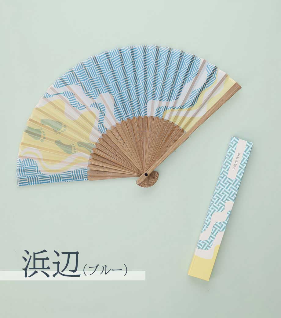 夏の風景をモダンなイラストで表現したおしゃれ扇子。和柄を織り交ぜたデザインは、世代・性別を問わずお使いいただけます。