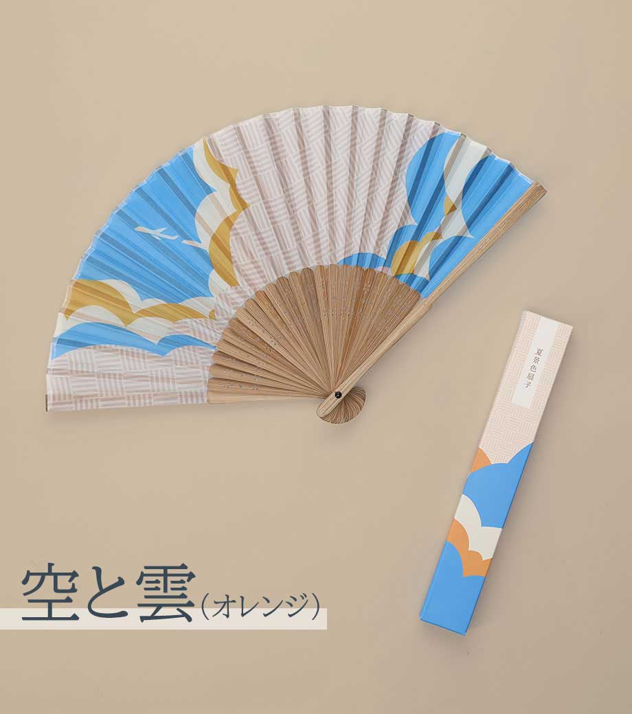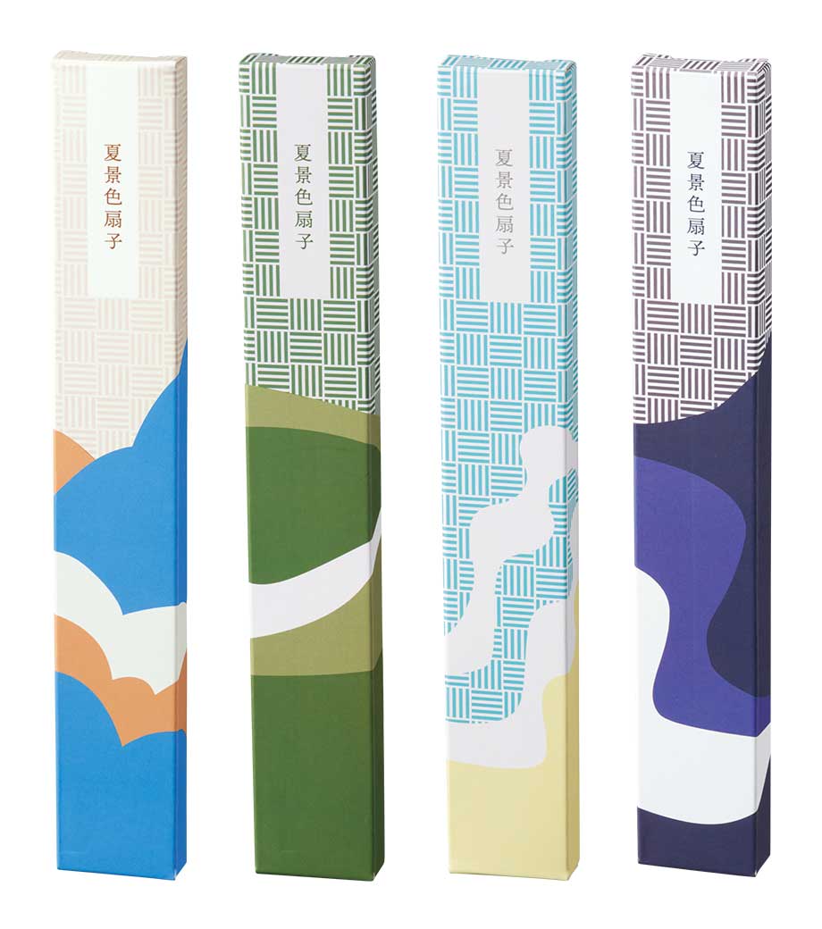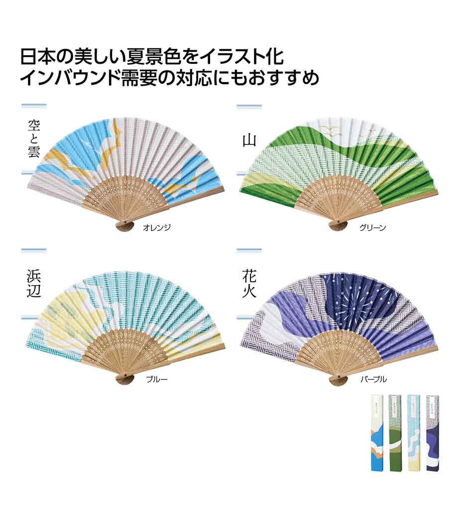 空と雲、山、浜辺、花火、4つのシーンをそれぞれ落とし込んだ4色を取混ぜでお届け。扇子の柄に合わせた化粧箱入りです。インバウンド向けノベルティや、サマーイベントの景品や参加特典などでの配布にいかがでしょうか。