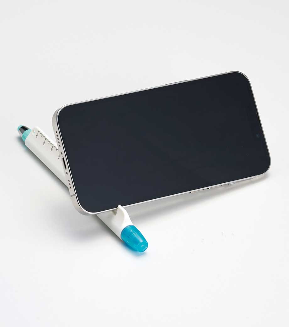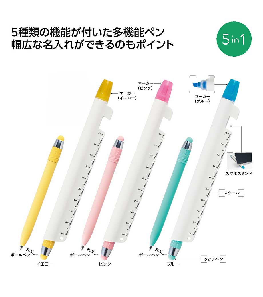 1本で5通り使える、あると便利な多機能ペンです。スマホスタンド、水平器、+-ドライバー、ボールペン、スケール(70mmまで)が一つになっています。軸に1色ロゴ印刷をして、建築関係・不動産関係の販促品やセミナー・イベントのプレゼントにもオススメ!カラフルなメタルカラーが目を引きます。ペンケースや胸ポケットに常備しておけば様々なシーンで活躍します。