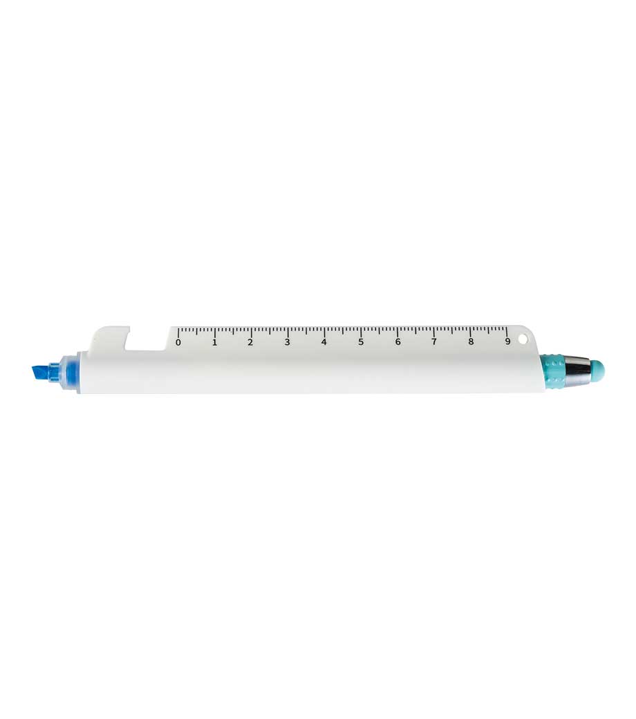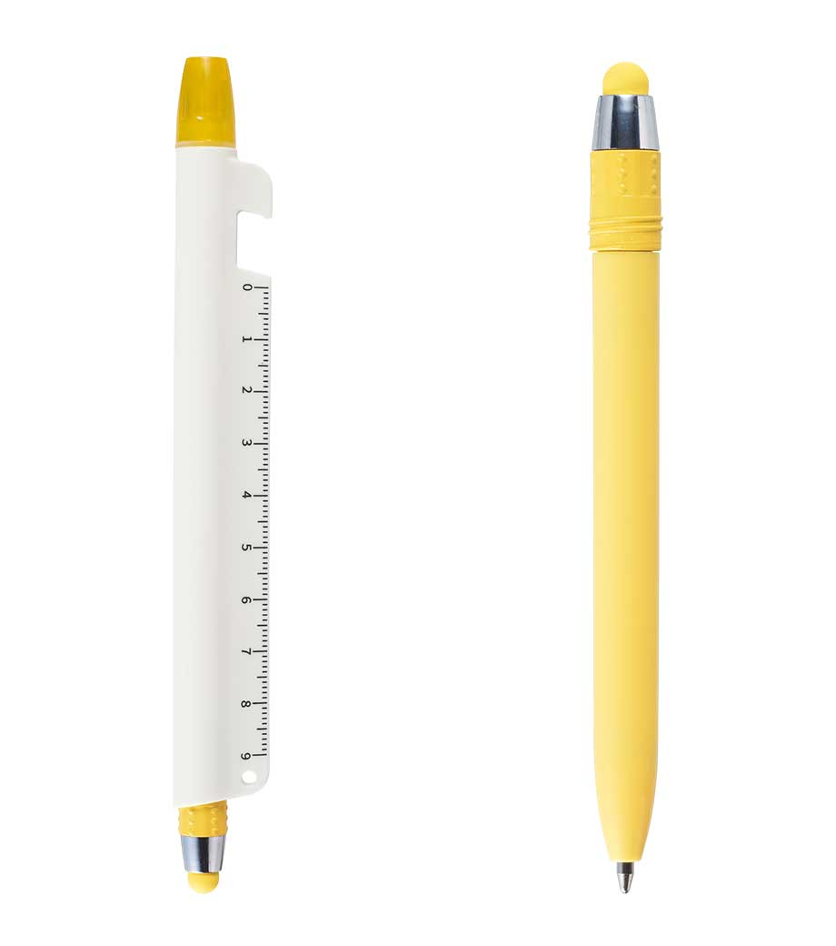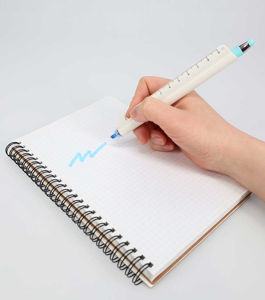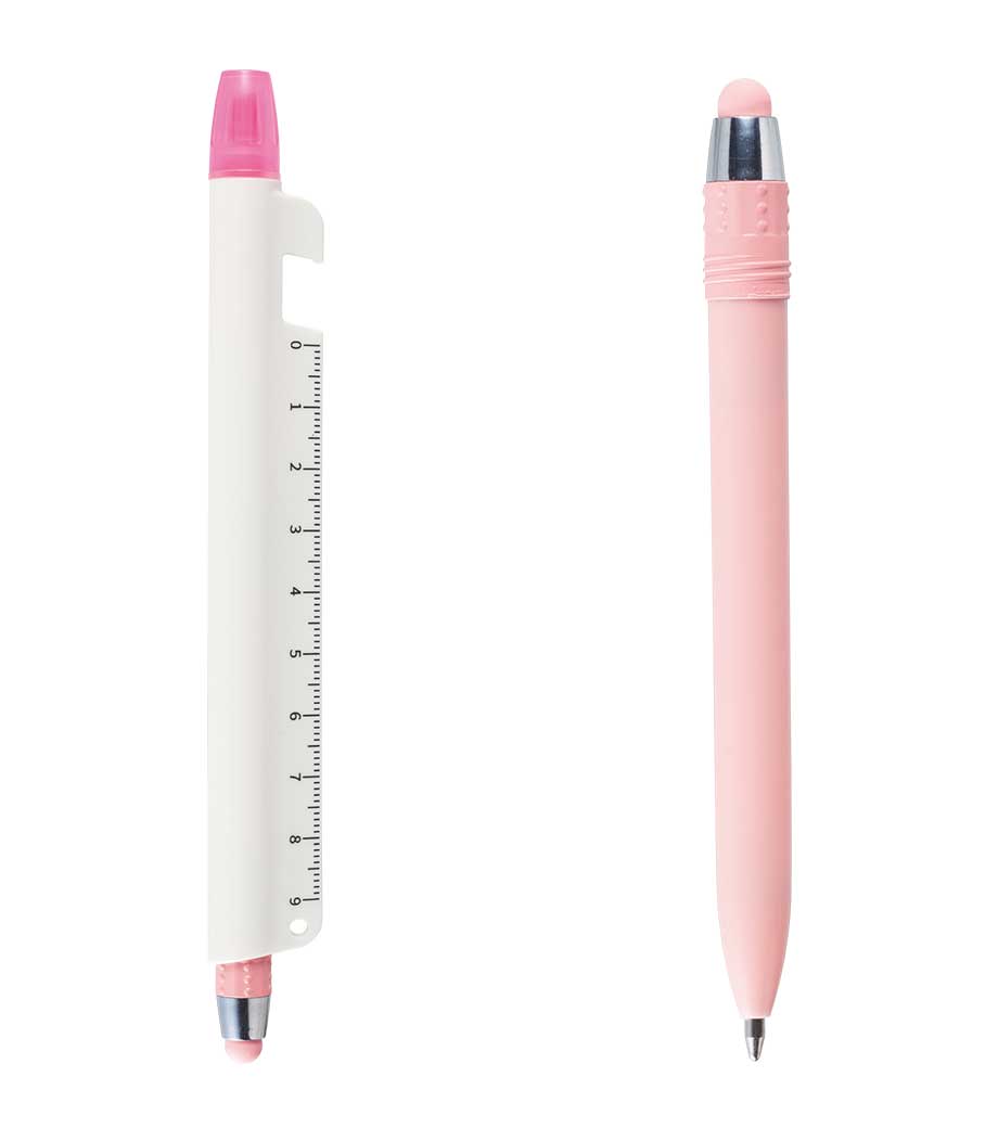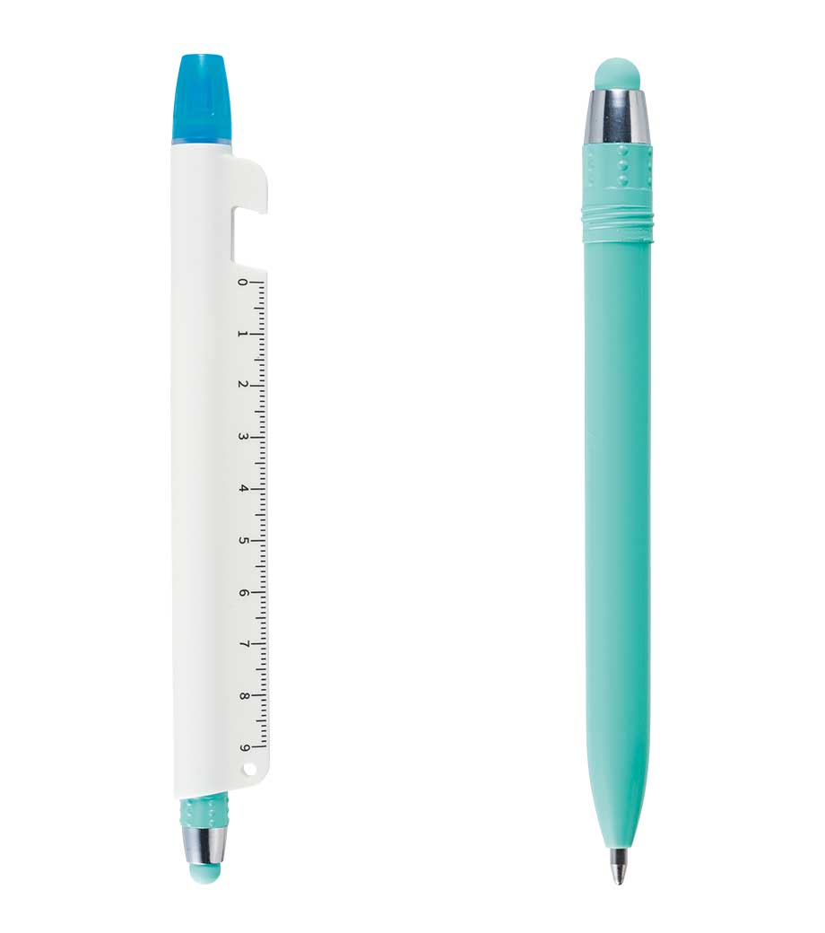 あると便利な多機能ペン。スマホスタンド、水平器、+-ドライバー、ボールペン、インチ・センチ・1/200表示の3種のスケールが一つになっています。
