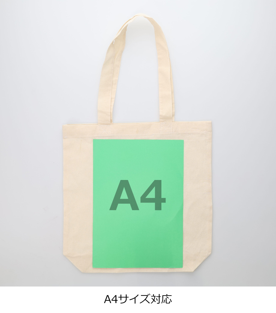 縦横比がほぼ同じで、トレンド感あるデザインの肩掛けコットンバッグです。A4サイズ対応で底マチがあるのでコンパクトなのに収納力があります。約5オンスの生地でかさばりにくいです。資料の持ち帰りだけでなく、普段使いのサブバッグとしても重宝します。