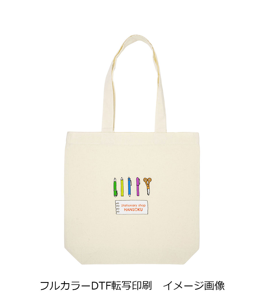 バッグ本体の生地は7オンス相当の厚みがあり丈夫。お買い物用としてもメインバッグとしても持ち運べる使い勝手のよさが魅力です。1色、2色、フルカラーで名入れ可能。ロゴやキャラクターを入れたオリジナルバッグが制作できます。購入特典などのキャンペーン販促品やグッズ制作に人気のノベルティです。
