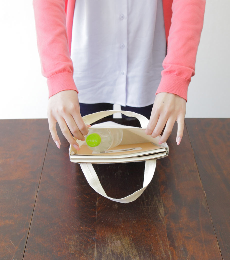 コットンコンビニ袋は大きいお弁当がすっぽり収まる幅広マチ仕様。コンビニなどで購入したお弁当を偏ることなく運べます。縦のサイズはA4とほぼ同じなので、カタログや雑誌などを入れることもできます。使わないときはくるっとコンパクトにできるので携帯もラクラク。