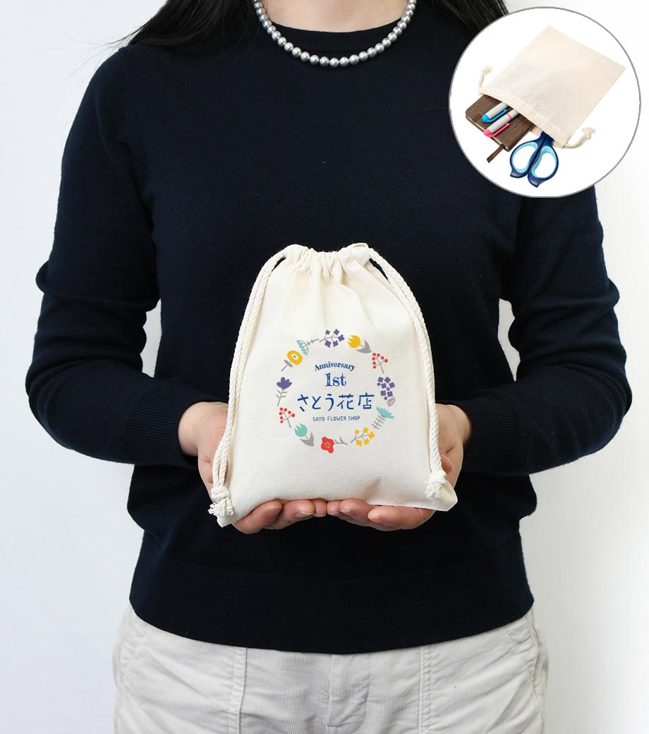 ショップ・ブランドロゴを入れてオリジナル巾着をつくりませんか?DMと一緒にメール便でも送れるサイズです。