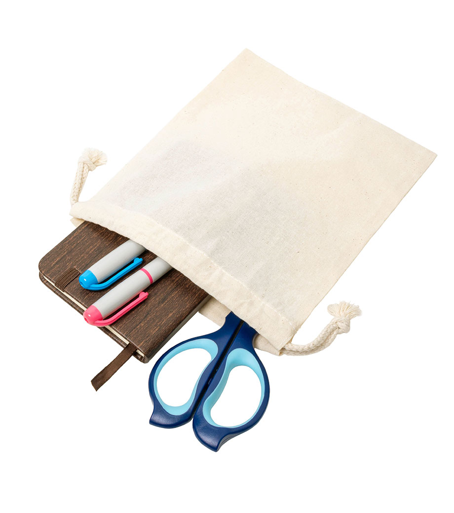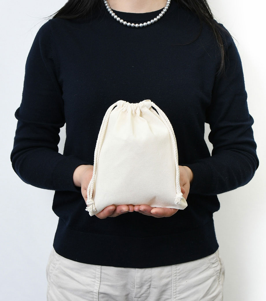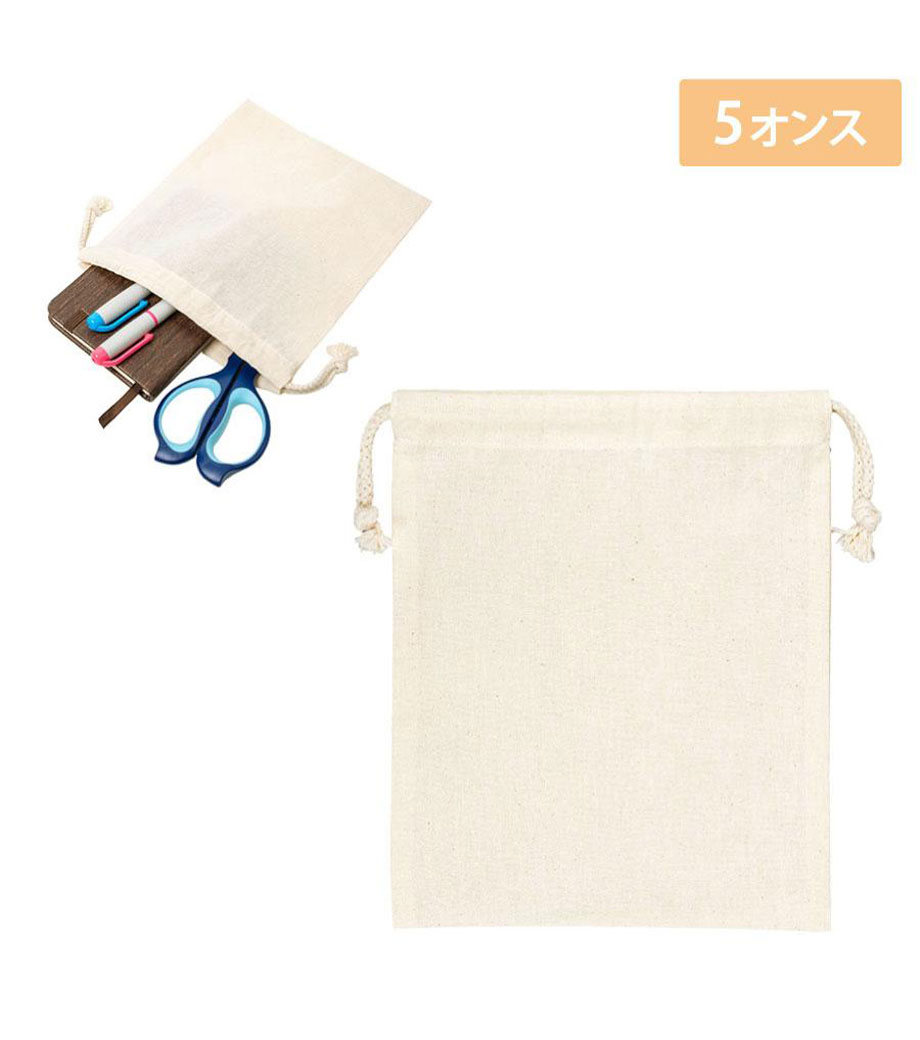 ベーシックで使いやすい5オンスの厚手コットン巾着。マチなしでリップや目薬など小物収納にぴったりです。紐部分は共生地を使用。安価でも高級感のある印象です。