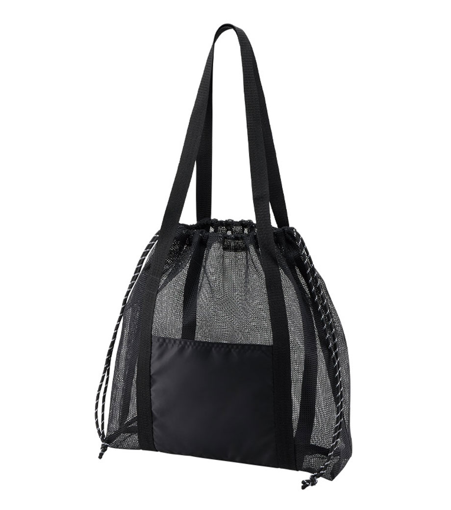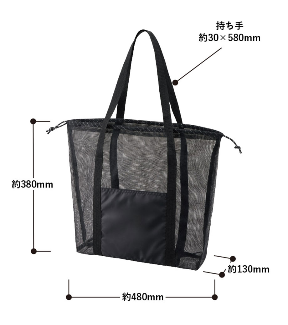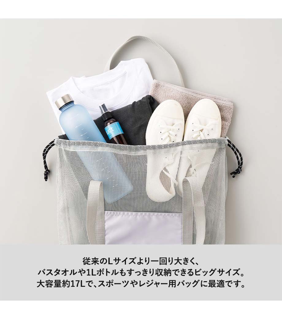 中身が見えるメッシュ素材を使用したビッグサイズトート。口元を絞れる巾着仕様です。容量約17Lのマチ付きタイプで、バスタオルと着替えなどかさばるものも入れられます。ジムバッグや水場のレジャーでの使用におすすめ!持ち手は肩掛けができる長さで、荷物が重くても安心。スマホなどを入れられる便利な外ポケット付きです。