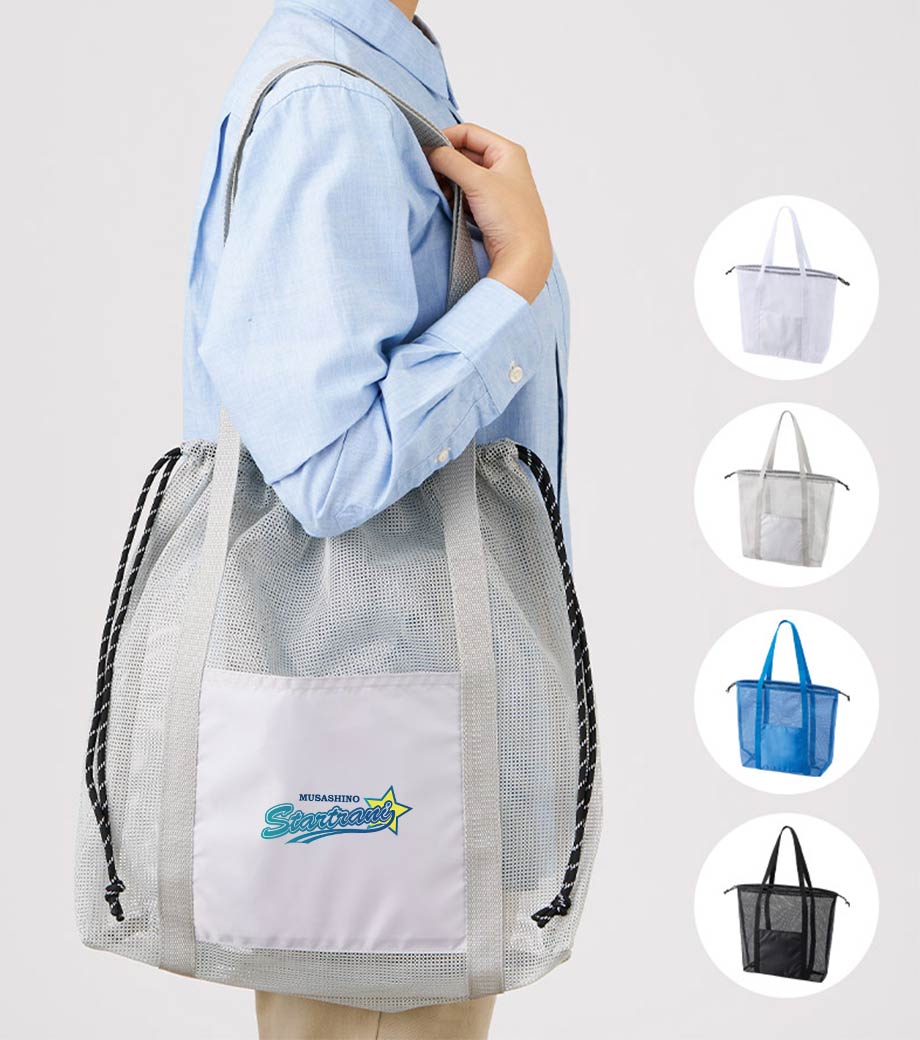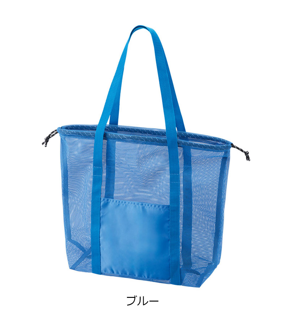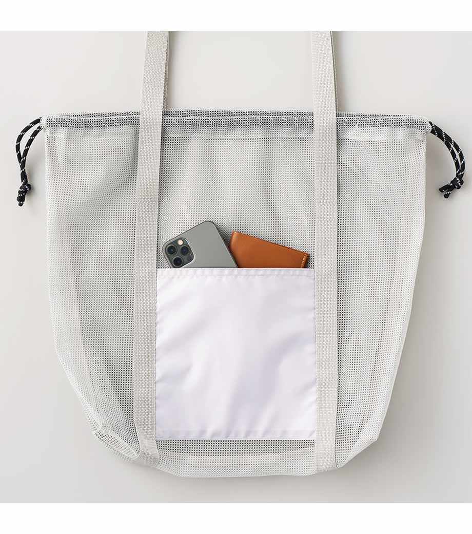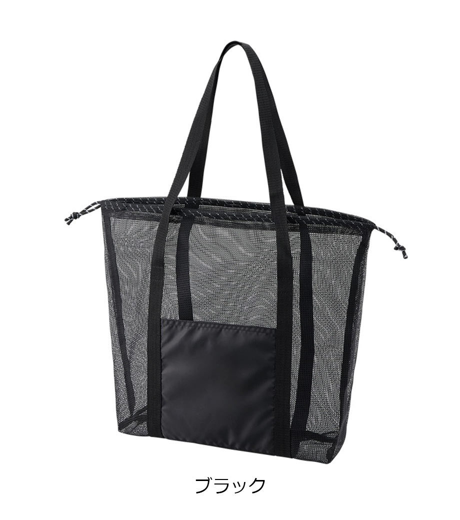 中身が見えるメッシュ素材を使用したビッグサイズトート。口元を絞れる巾着仕様です。容量約17Lのマチ付きタイプで、バスタオルと着替えなどかさばるものも入れられます。ジムバッグや水場のレジャーでの使用におすすめ!持ち手は肩掛けができる長さで、荷物が重くても安心。スマホなどを入れられる便利な外ポケット付きです。