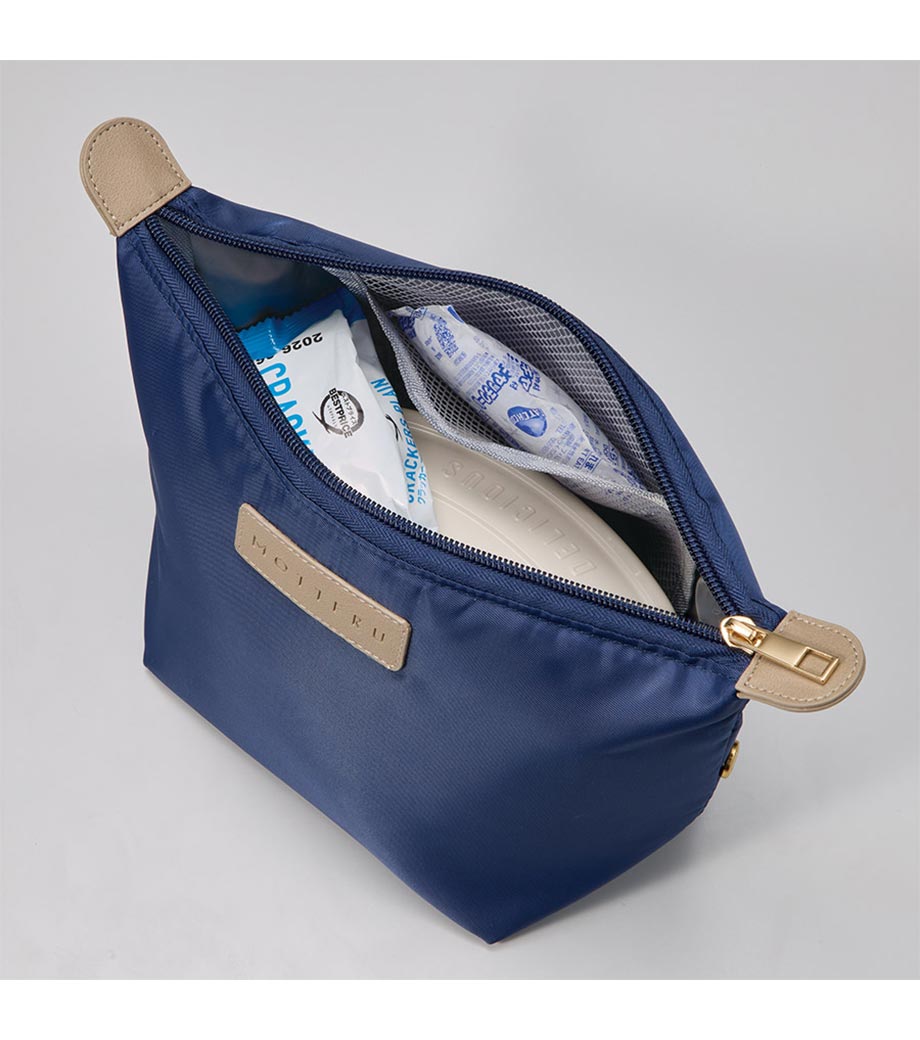 2つに仕切られた内ポケットには、ICカード・スマホ・家の鍵などを入れられます。バッグの中で小さなものがばらつかず便利。クチにはホックボタン付で、荷物の飛び出しをガードします。