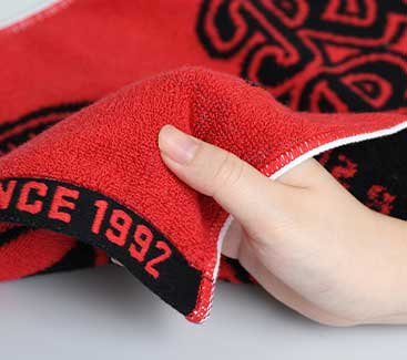 2色のパイル糸を織り、柄や文字を表現した毛違いジャガードタオルです。タオルの裏は色反転の鏡面になり、表裏リバーシブルとして楽しめます。ヘム(両端のミミ)にも文字入れができるので、よりオリジナルの高いタオルが作成できます!