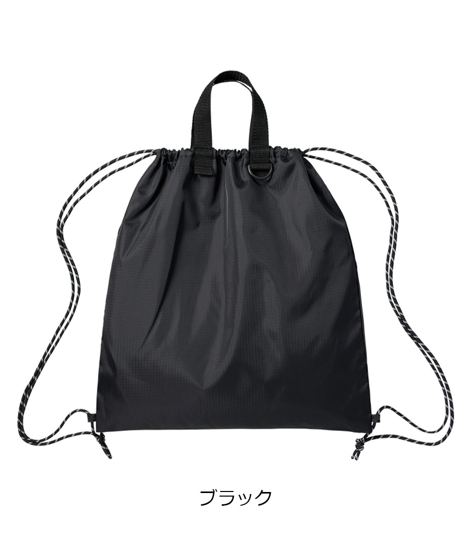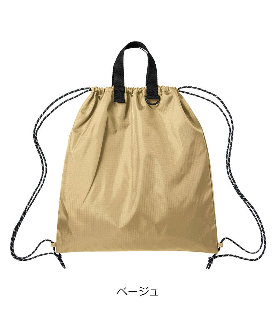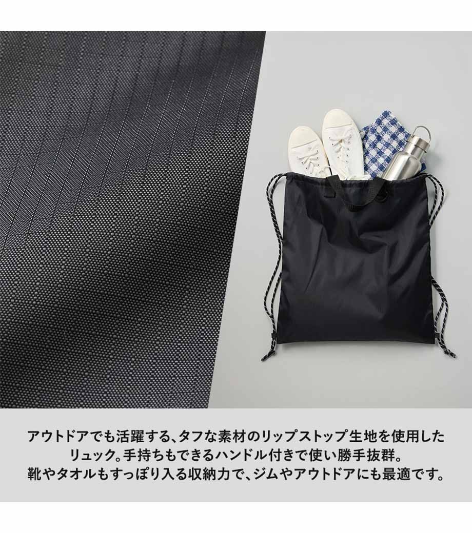 丈夫なリップストップ生地を使用したナップサックです。軽量ながら耐久性に優れており撥水加工を施しているので水を弾きます。ナップサックとしても手提げとしても使える2WAY仕様です。広い開口部で中身の出し入れもラクラク。スポーツジムの着替え袋やシューズバッグとしても活躍します。