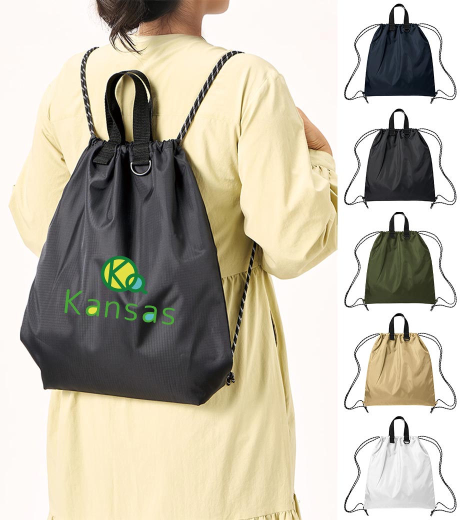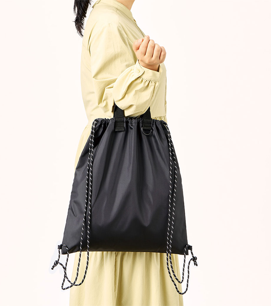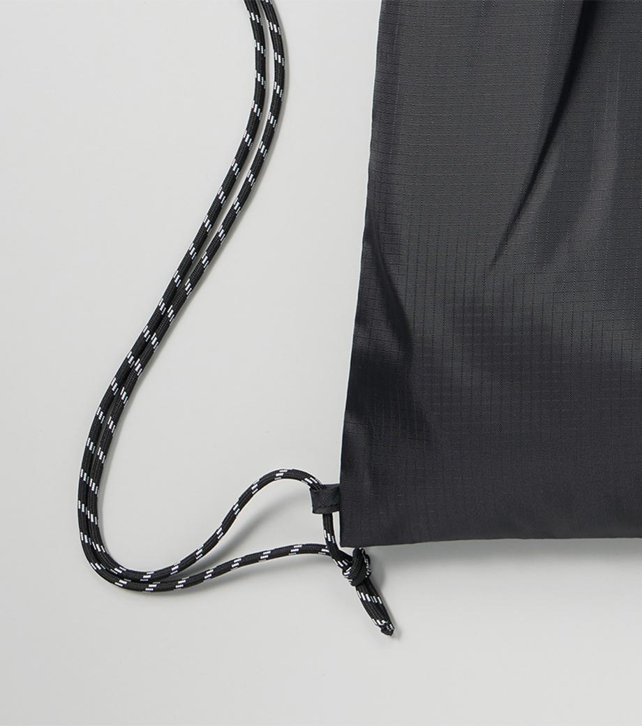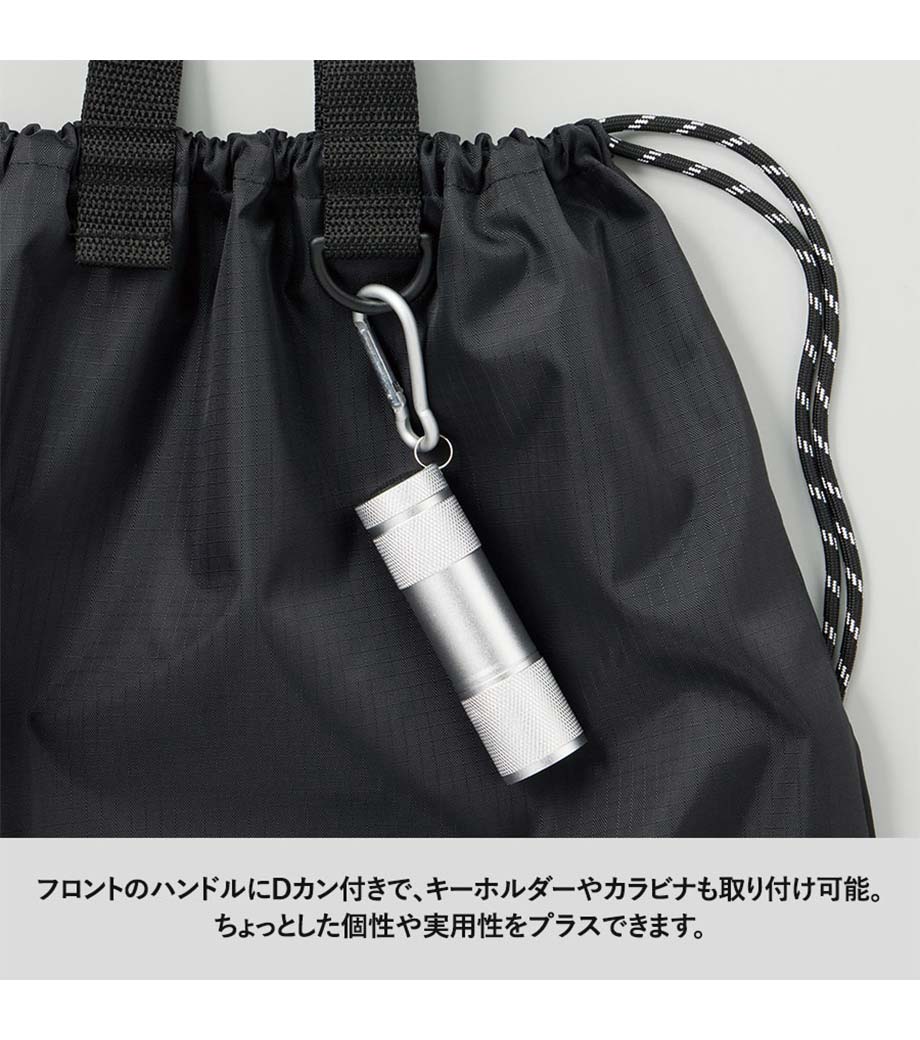 丈夫なリップストップ生地を使用したナップサックです。軽量ながら耐久性に優れており撥水加工を施しているので水を弾きます。ナップサックとしても手提げとしても使える2WAY仕様です。広い開口部で中身の出し入れもラクラク。スポーツジムの着替え袋やシューズバッグとしても活躍します。